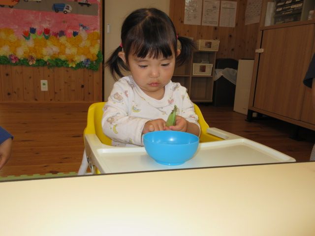 「あっ、あの豆だ・・」と、目を輝かせてグリンピースを選んで食べる子ども達。グリンピース独特の匂いもせず美味し顔の子ども達でした。
