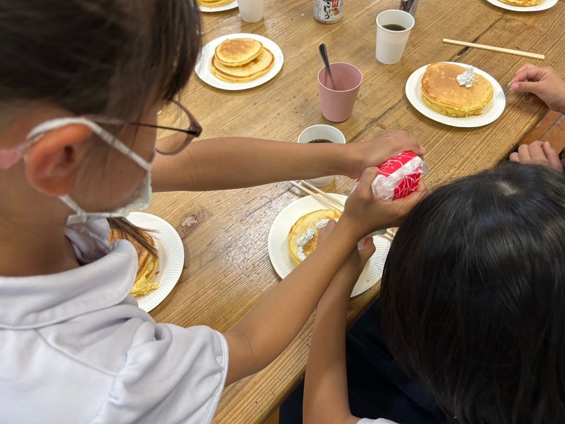 パンケーキが落ちないように支えてくれたり、一緒にフライ返しをもってくれたりと周りの子たちがフォローしてくれている様子がみられました。