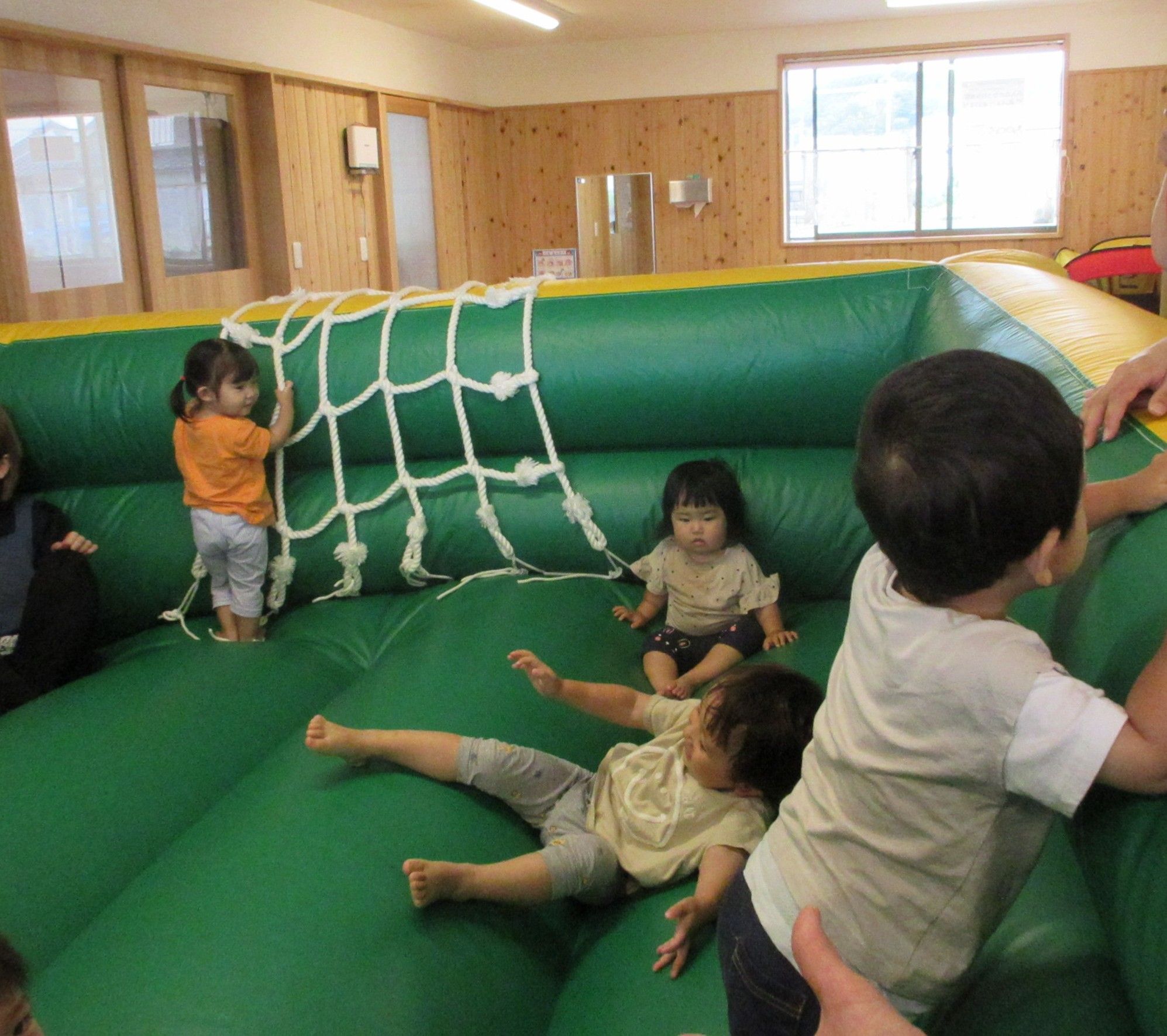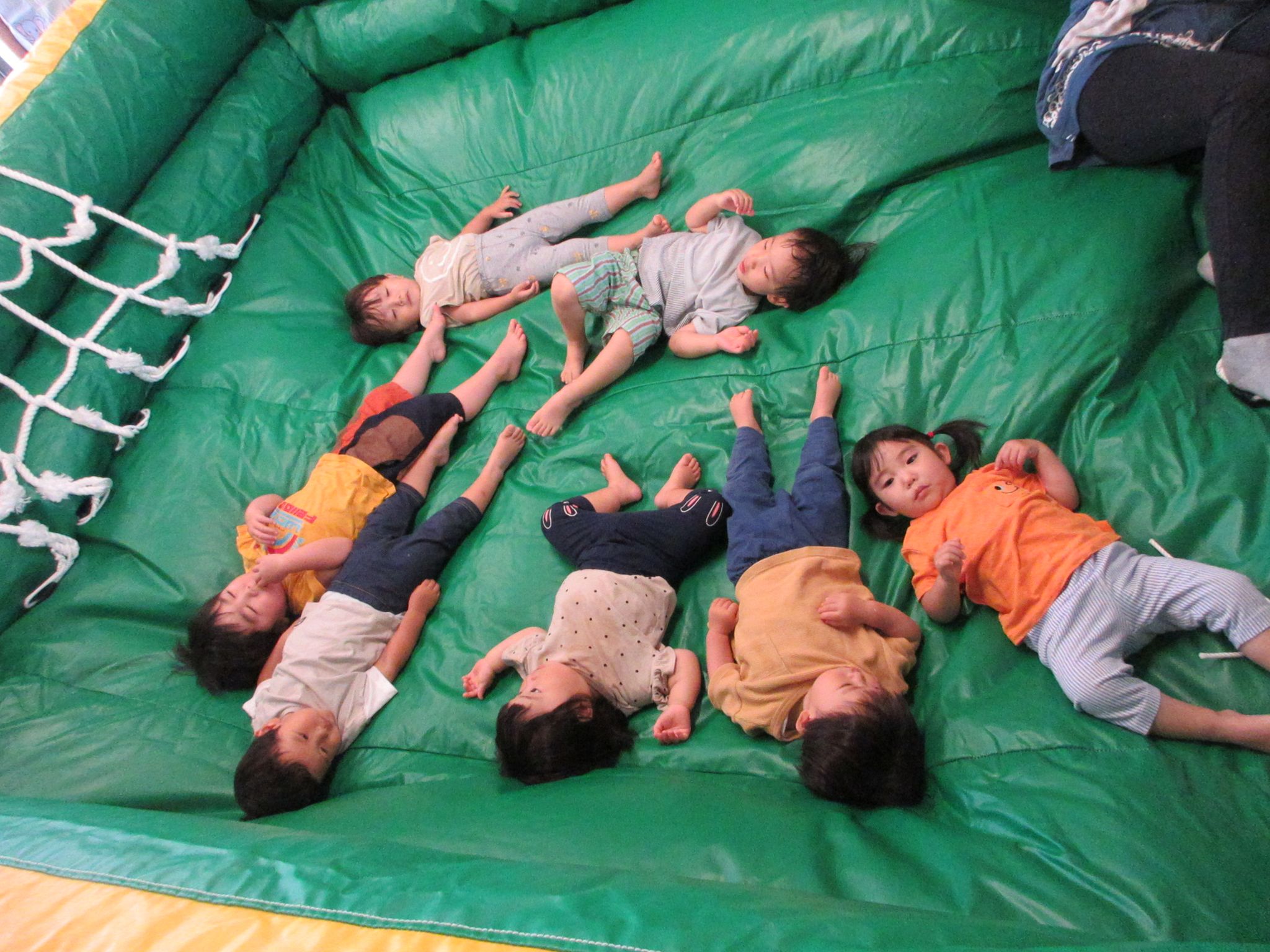 今年度初のエアーポリン。初めてのお友達がほとんどなのですが、さほど嫌がる事も無く、初めは寝ころび、次は座って、次は立って、慣れてきた2・3才のお友達は、走ってジャンプしてと楽しんでいました。