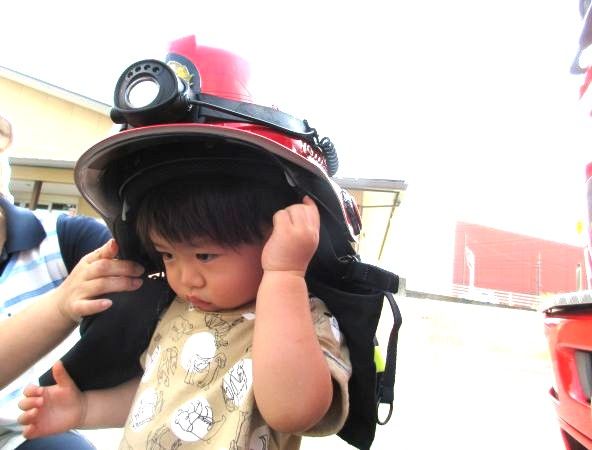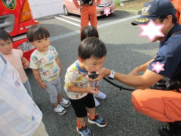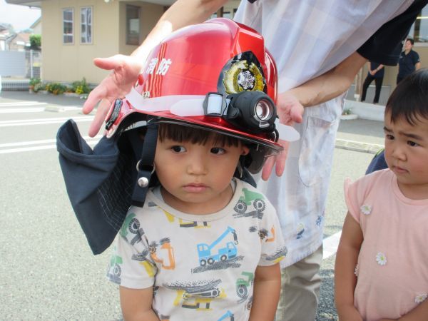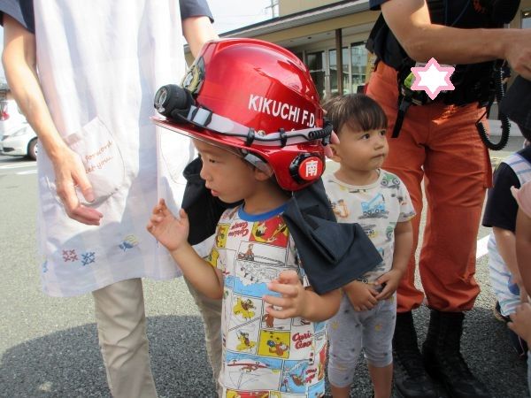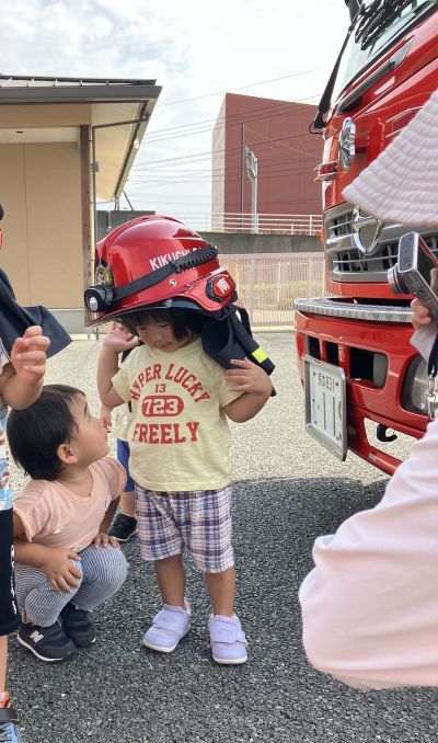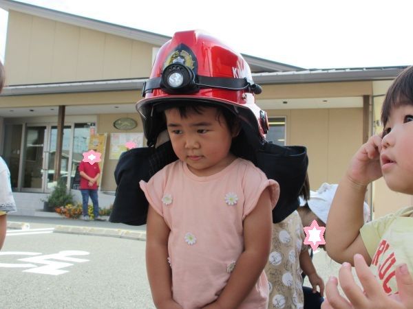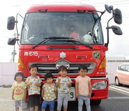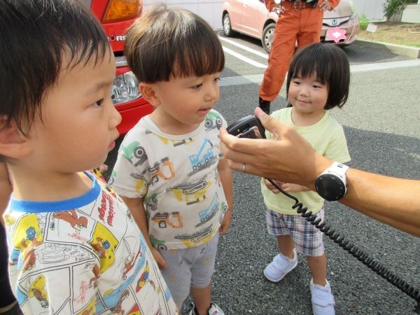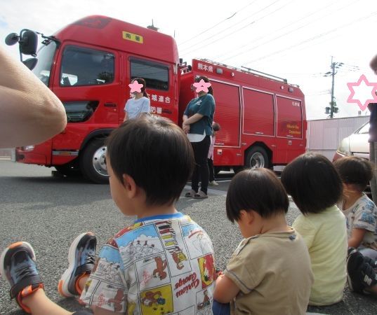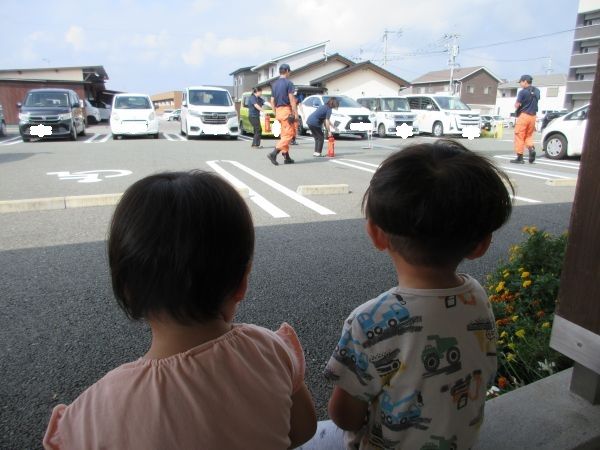避難したら大きくて赤い消防自動車👀 わくわくドキドキの子ども達。