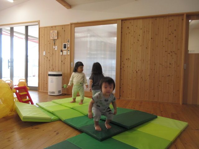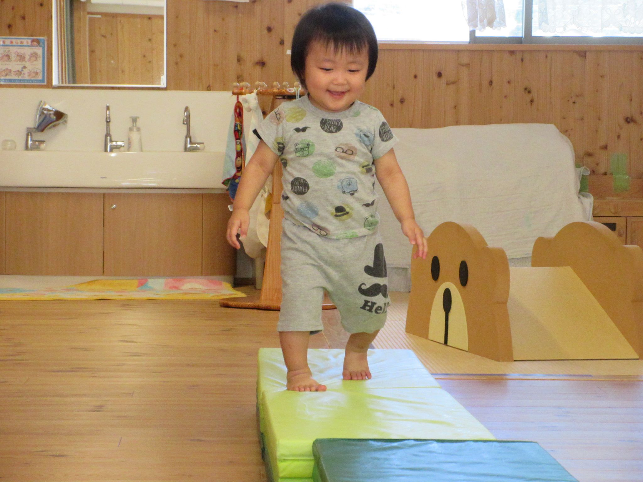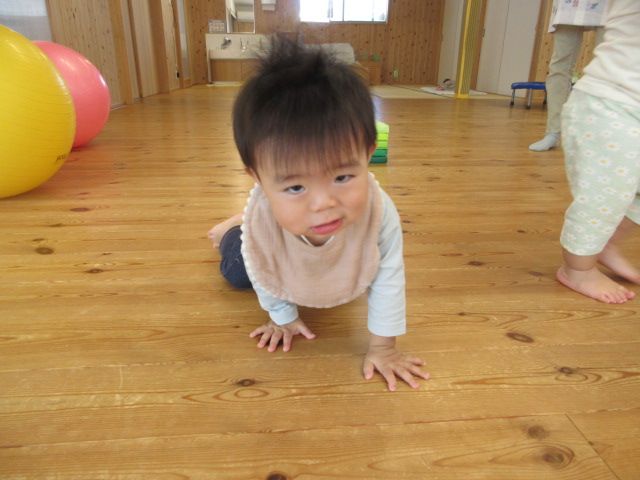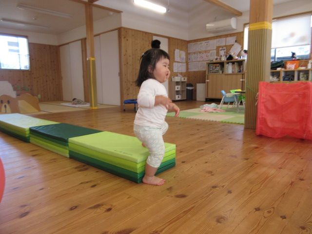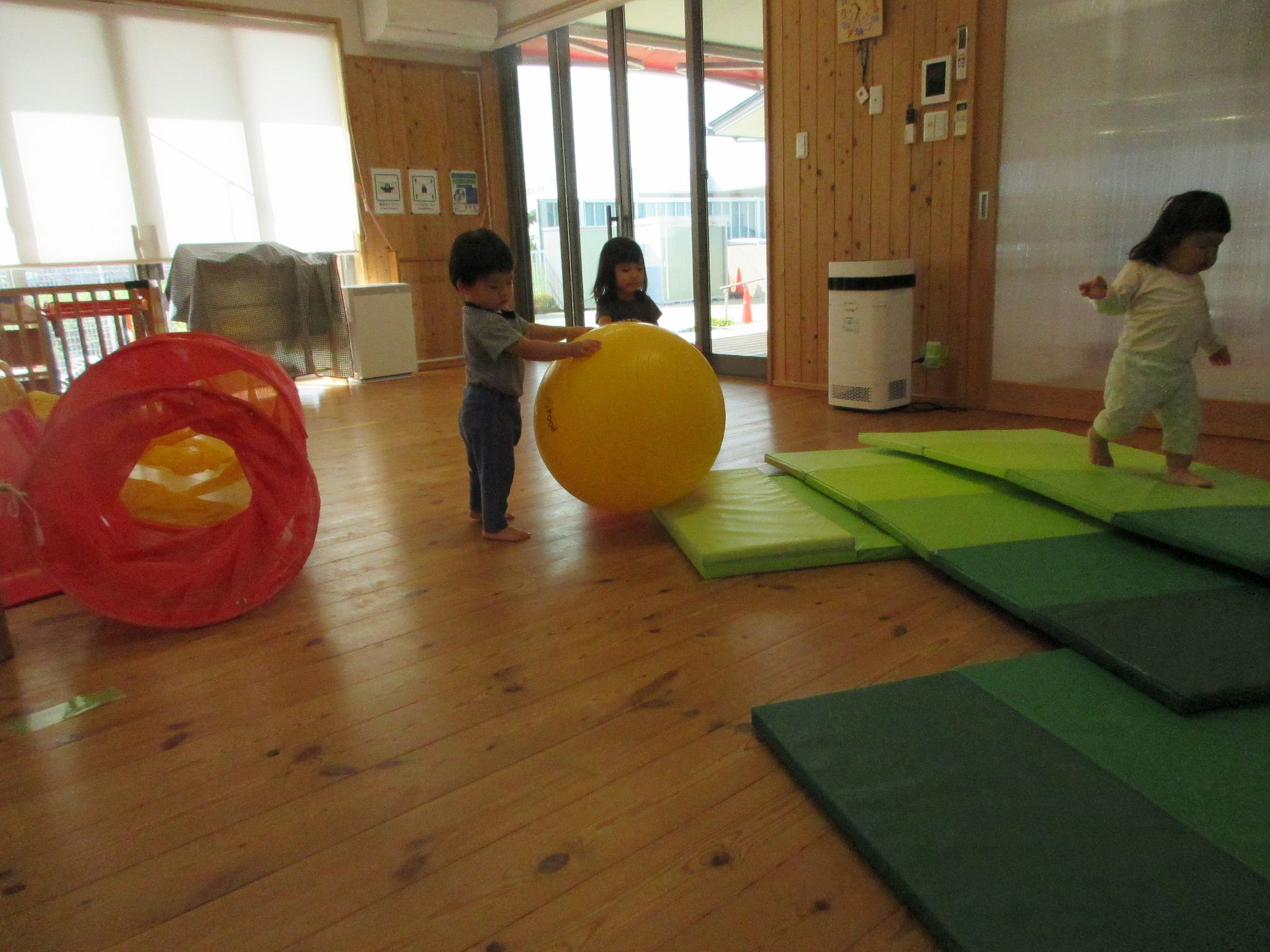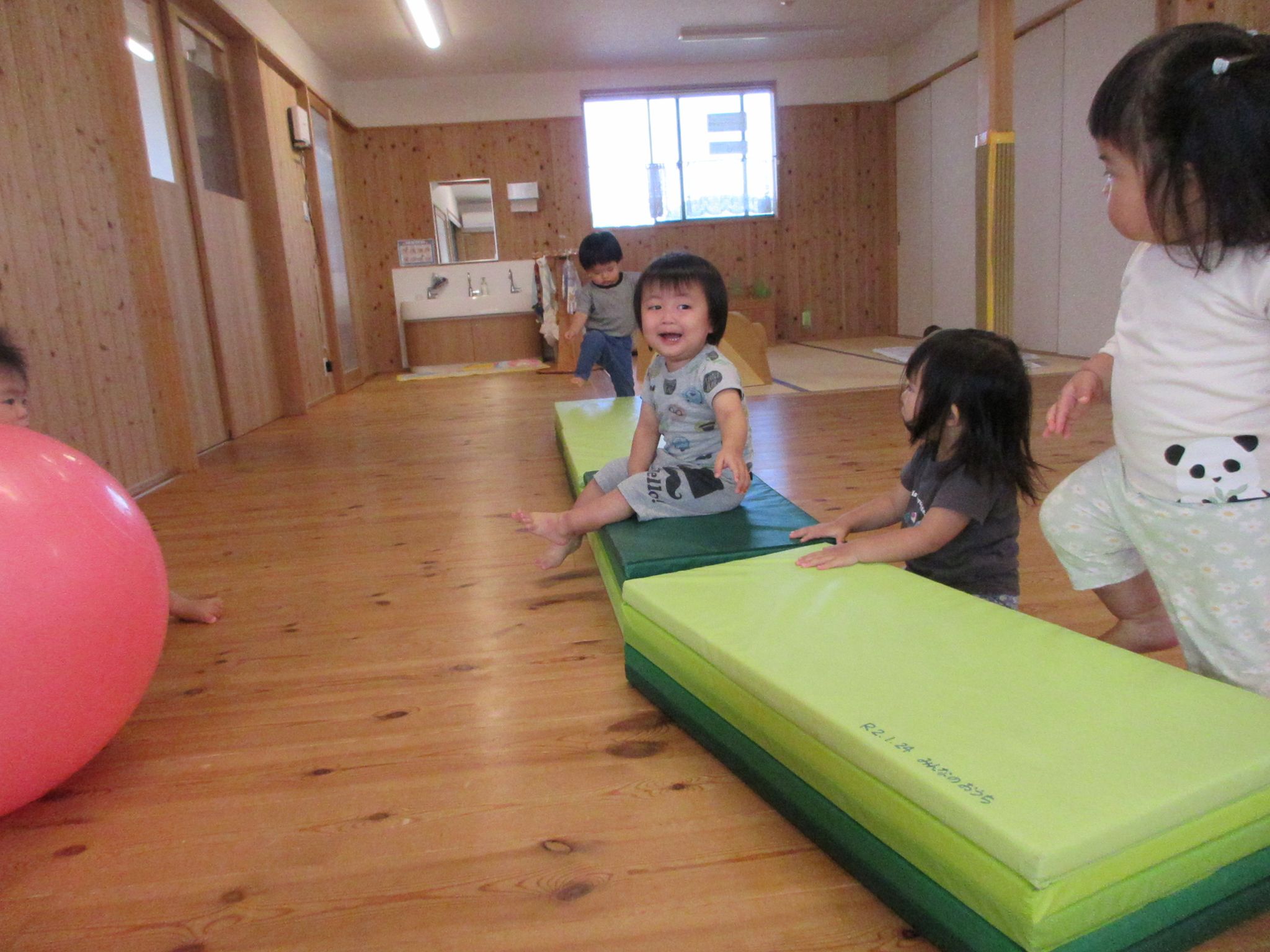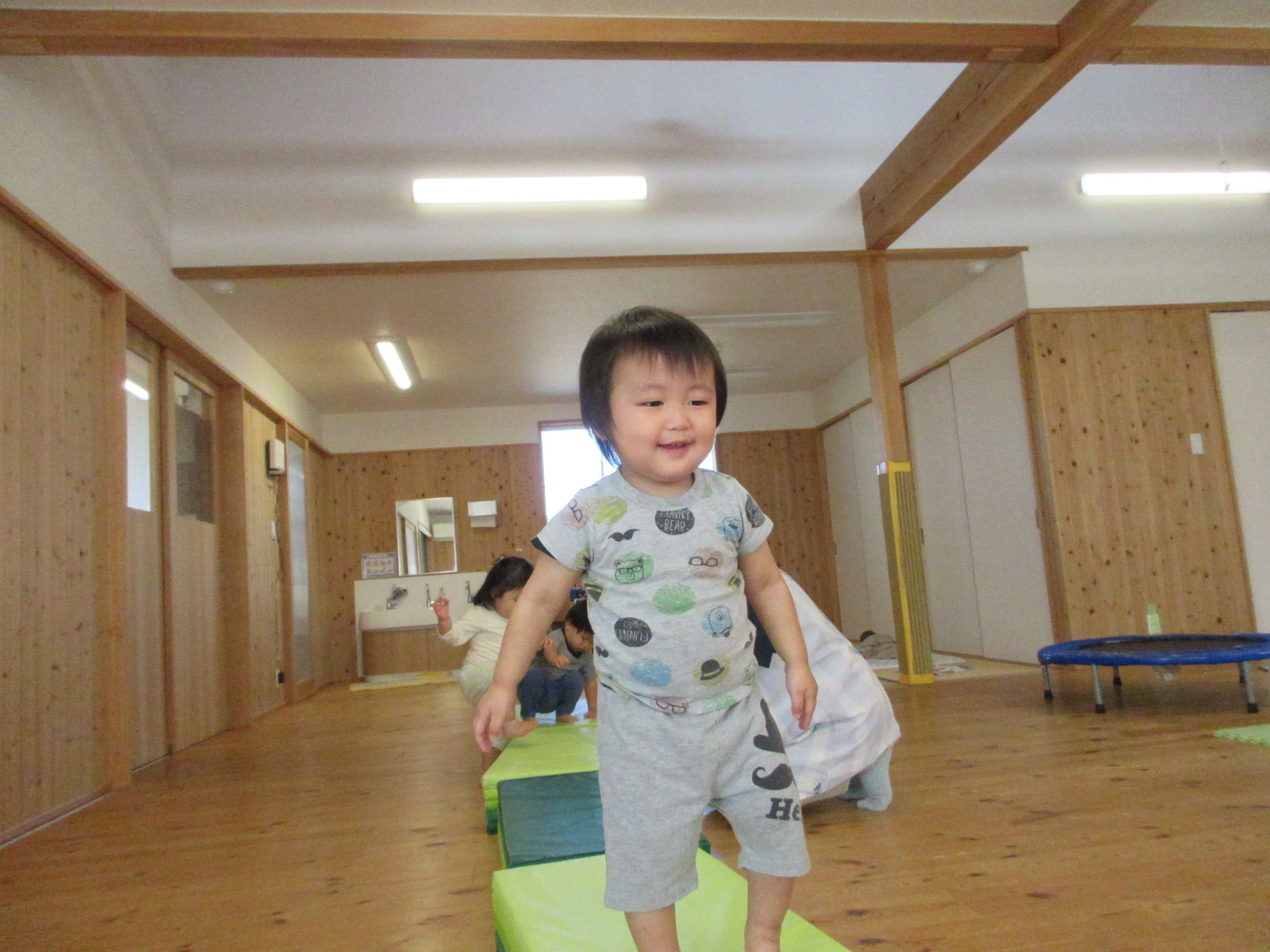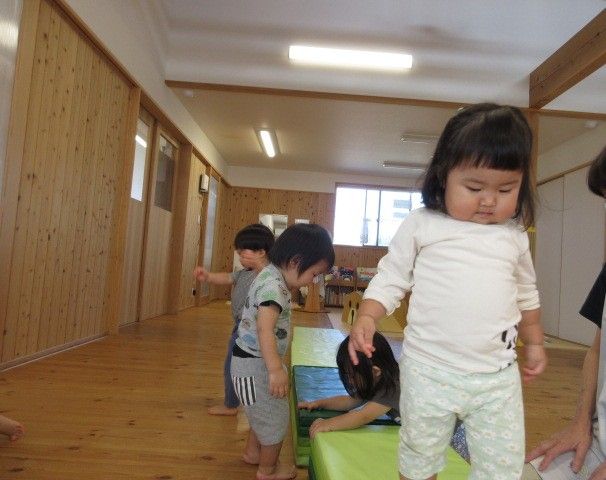 今年度3歳になるお友達が、おひさま保育園へ「リズム体操」にいっている間、0歳・1歳のお友達は、室内でたくさん身体を動かしました!(^^)!
