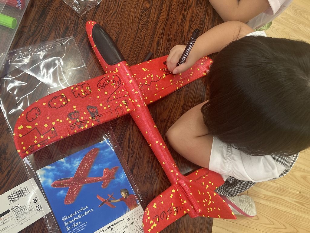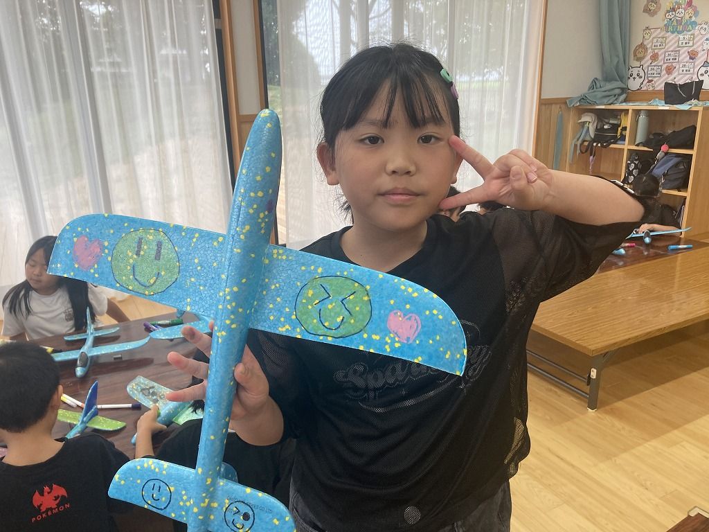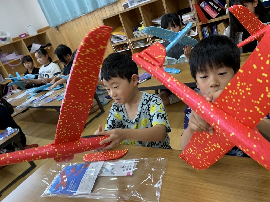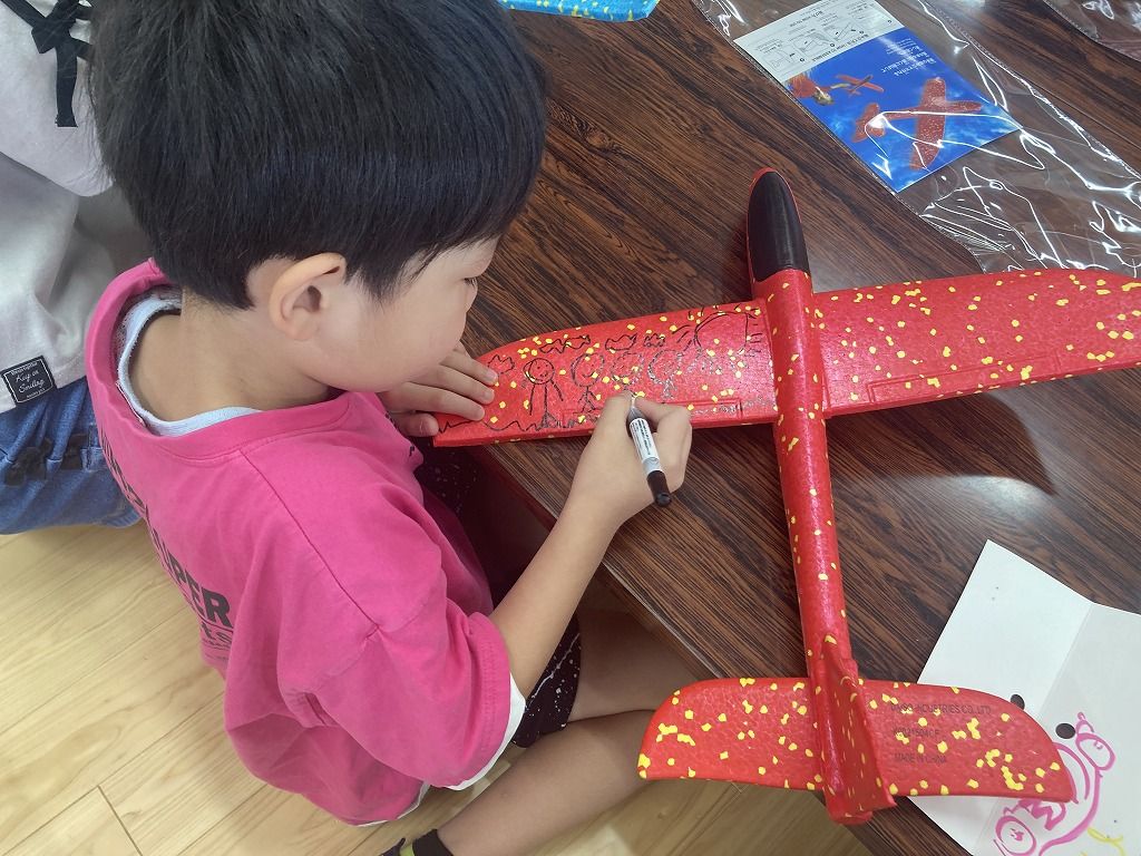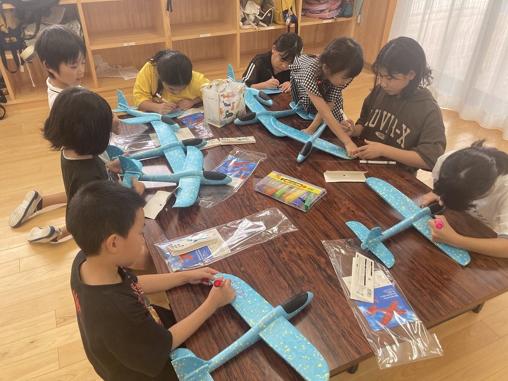 秋休み2日目・組み立て式グライダー制作をしました。 機体に主翼と尾翼を差し込み、絵を描いてオリジナルの飛行機を作りました。