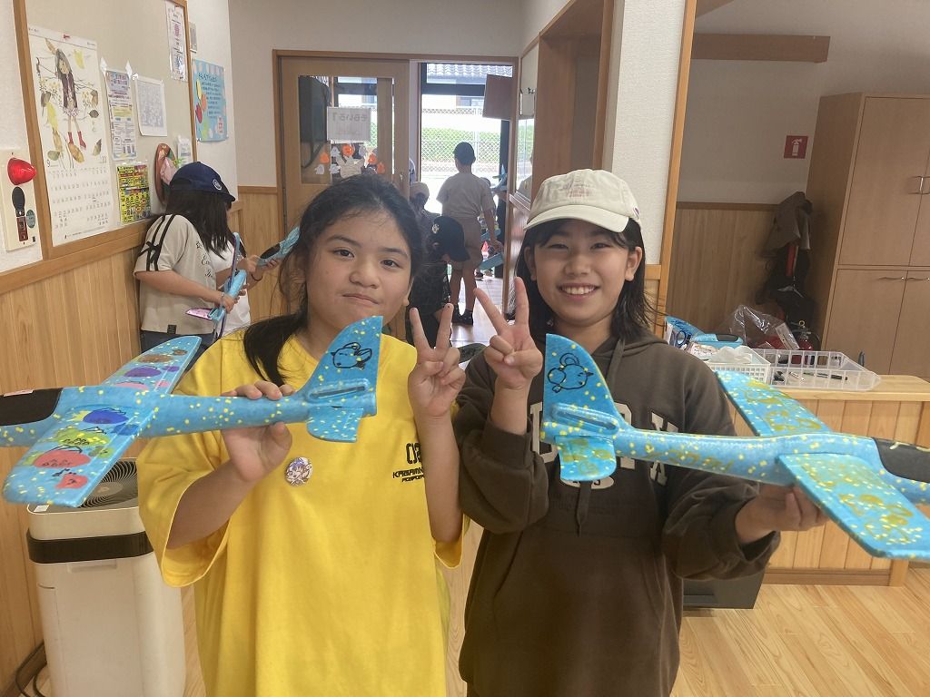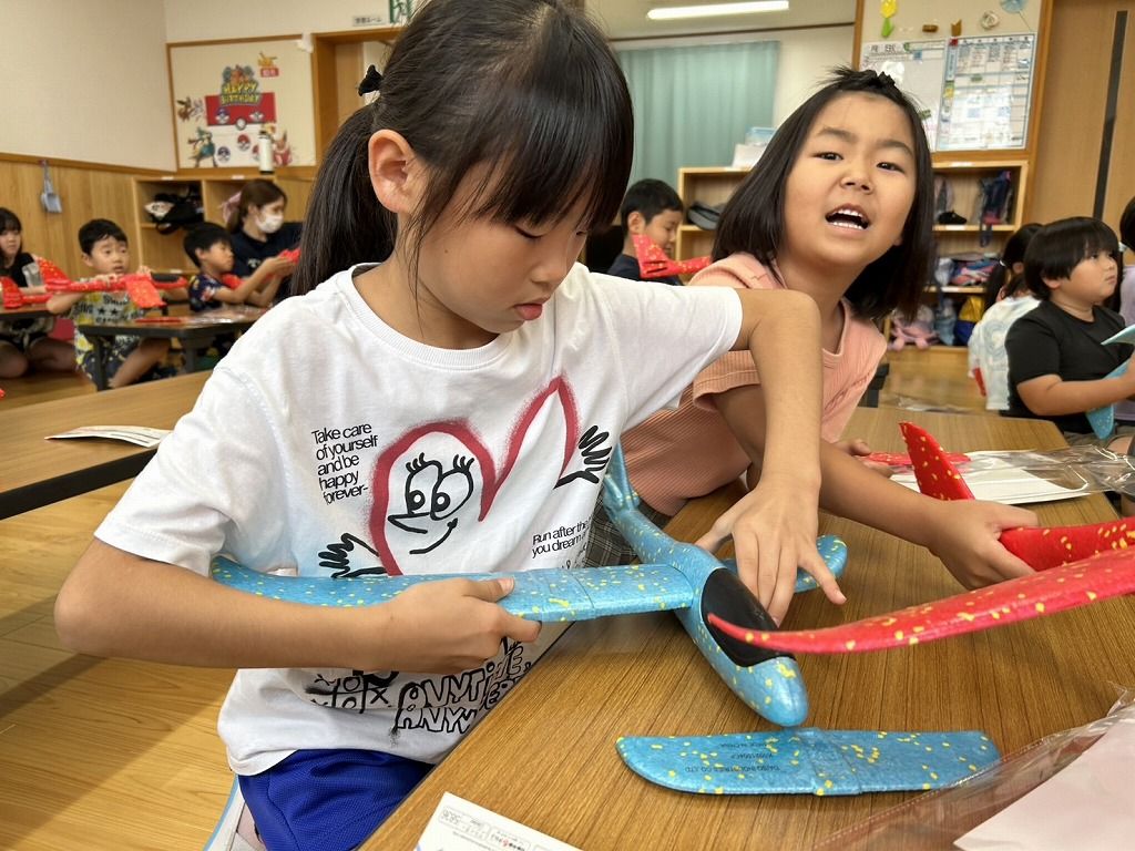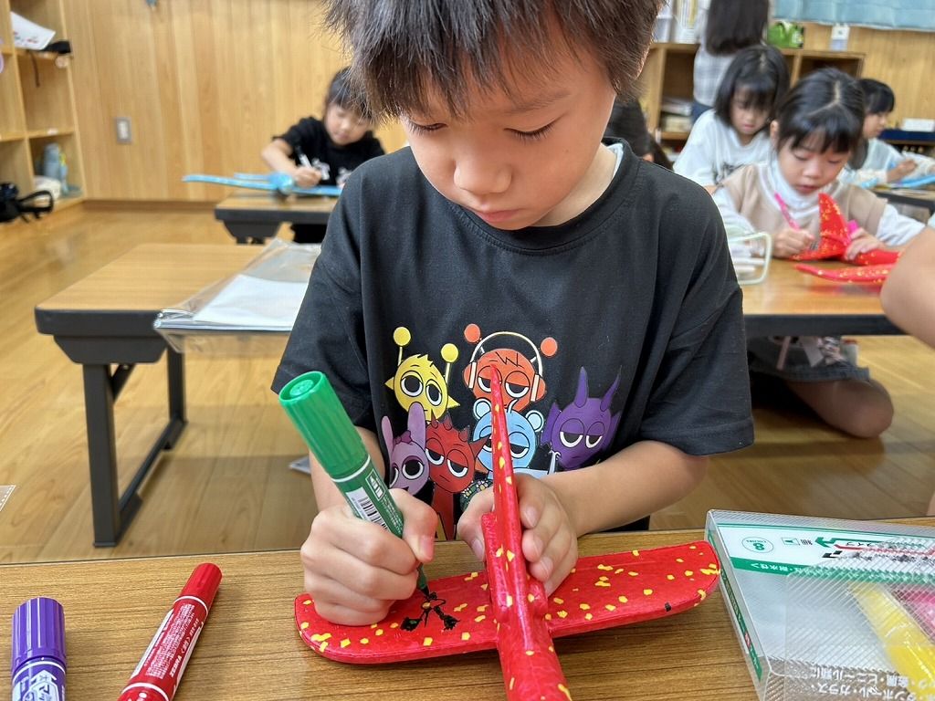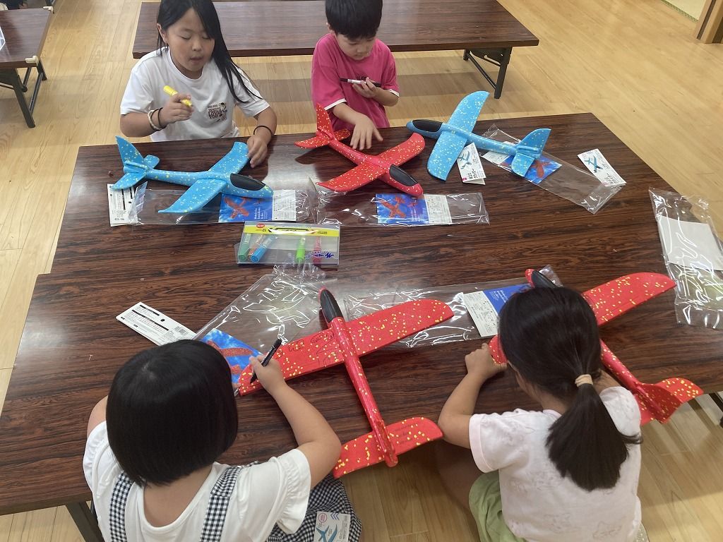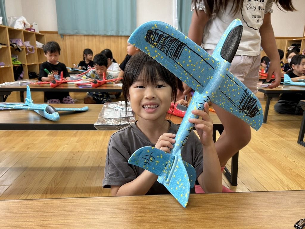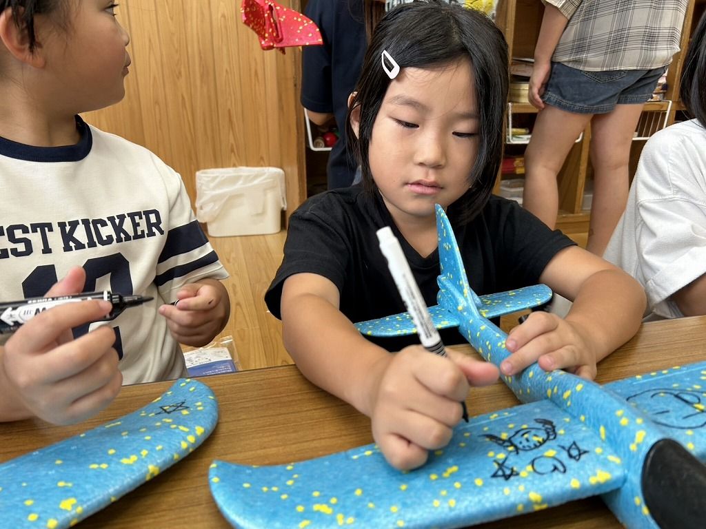 秋休み2日目・組み立て式グライダー制作をしました。 機体に主翼と尾翼を差し込み、絵を描いてオリジナルの飛行機を作りました。