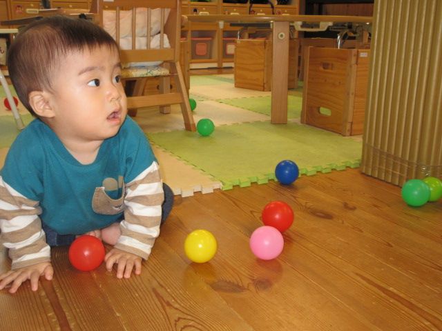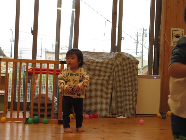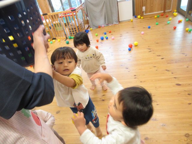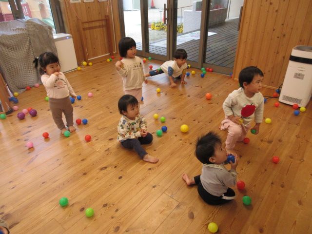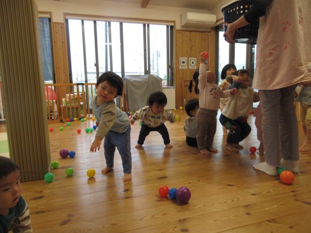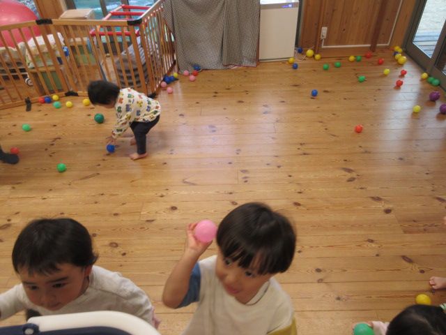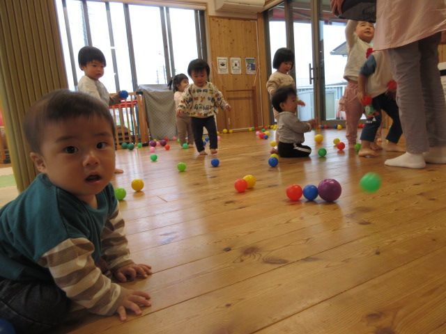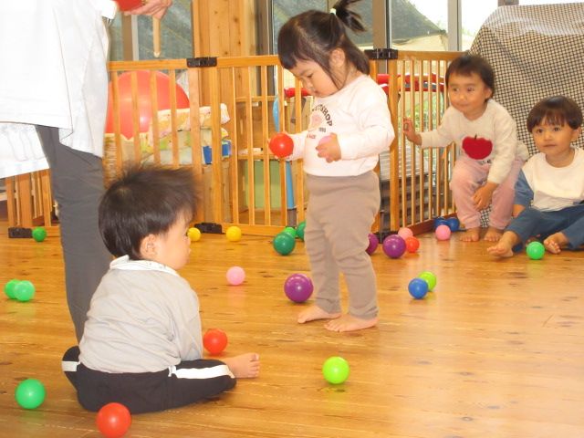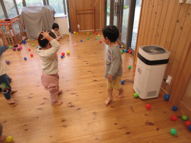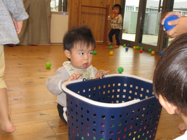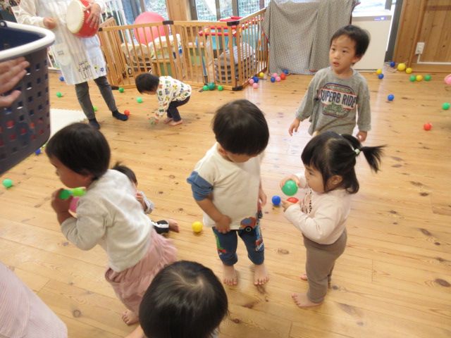 今日は、大玉転がし・親子でリズムダンス(フルーツポンチ)・玉入れ・みーつけたをしました。