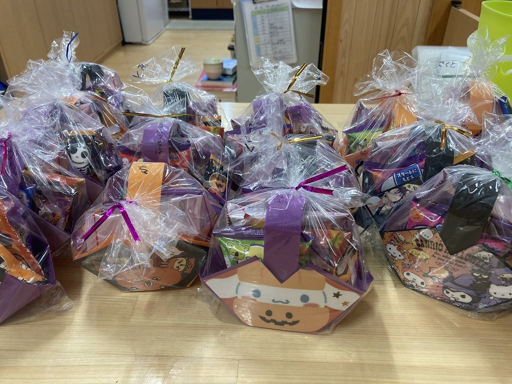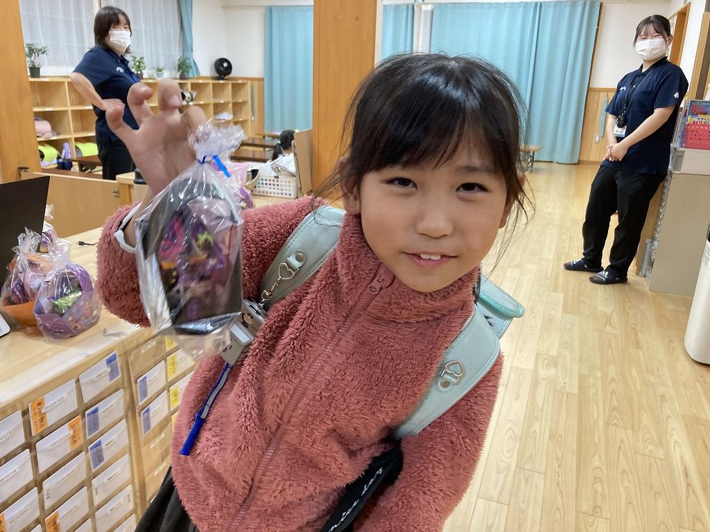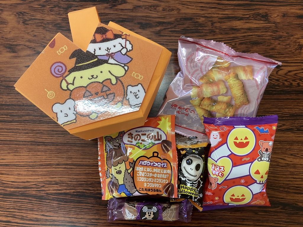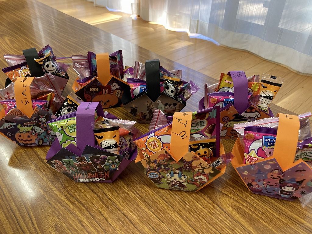 ハロウィンの日は、自分でつくったお菓子かごにおやつを入れてもらいました。
