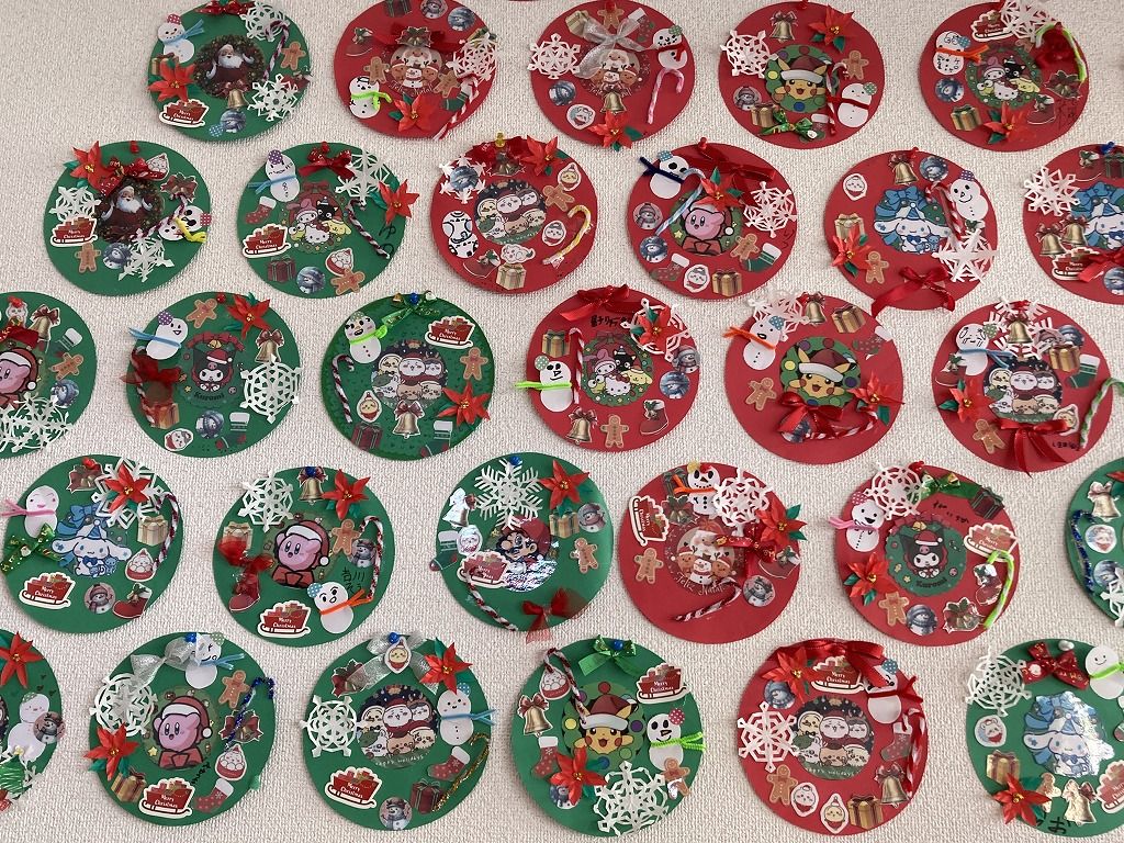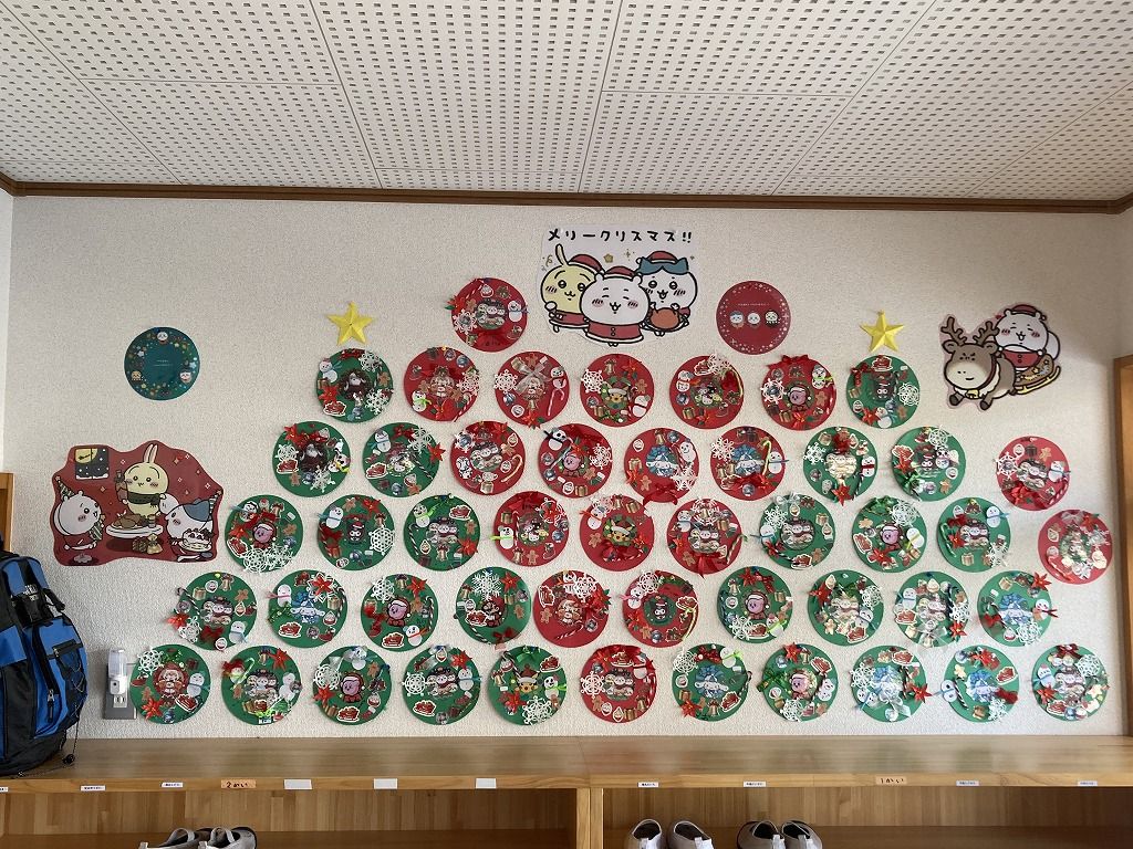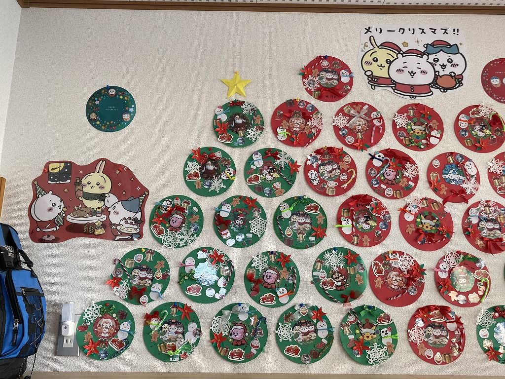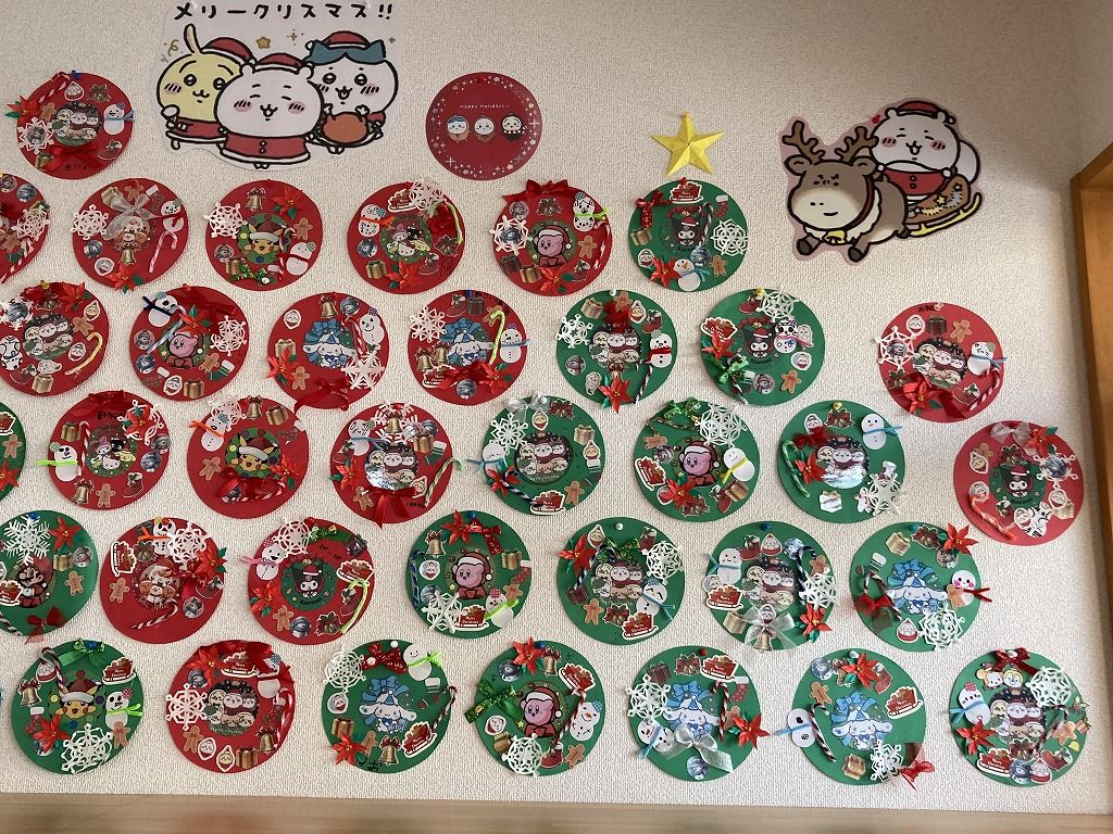 クリスマスリースの壁面飾りができました。 お迎えの時に、自分の作品をお父さん、お母さんに教えてあげてくださいね。