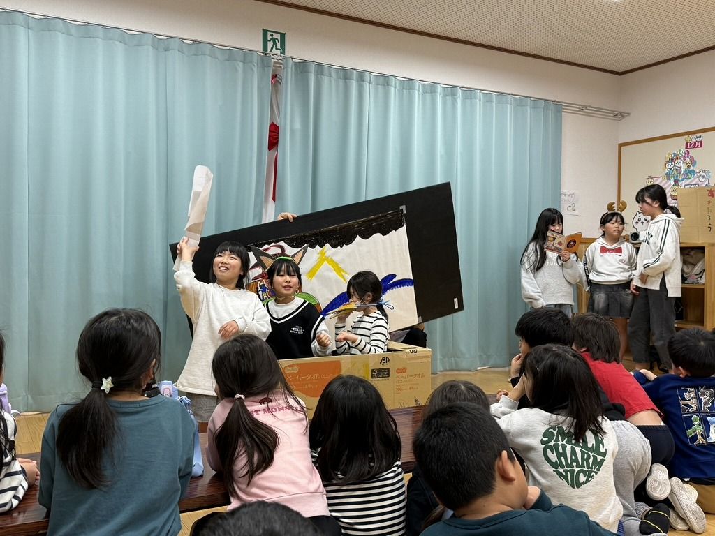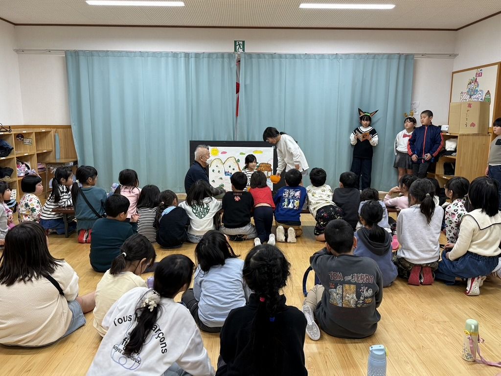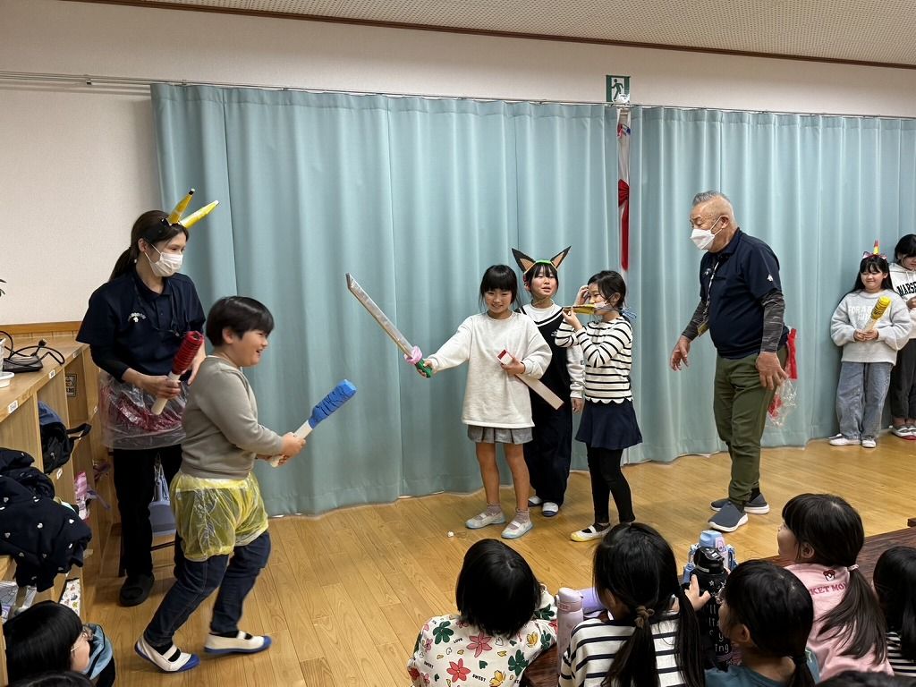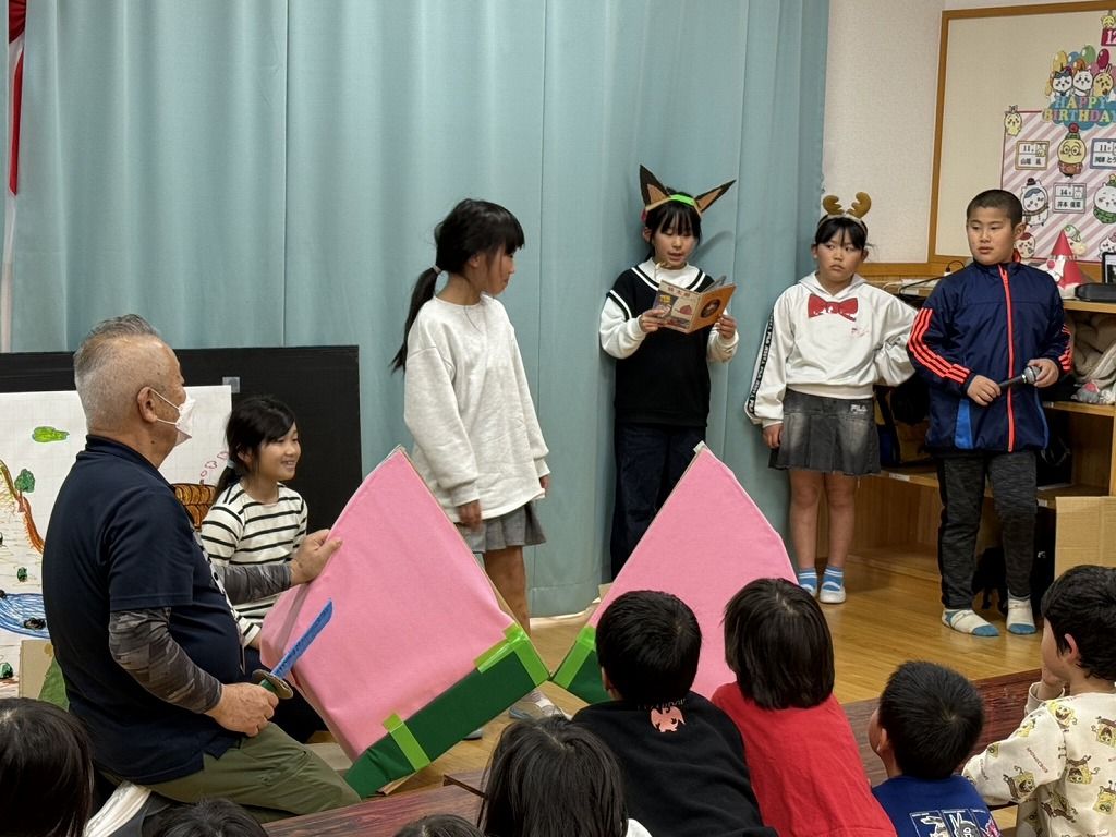 次は2組による、「桃太郎」ならぬ「あすたろう」の劇です。 子どもたちと相談して、桃や剣などの小道具、衣装も一緒に制作しました。 当日、主役が休みとなり、急遽代役をつとめたお友達もいましたが、 みんなで協力して一生懸命がんばりました。