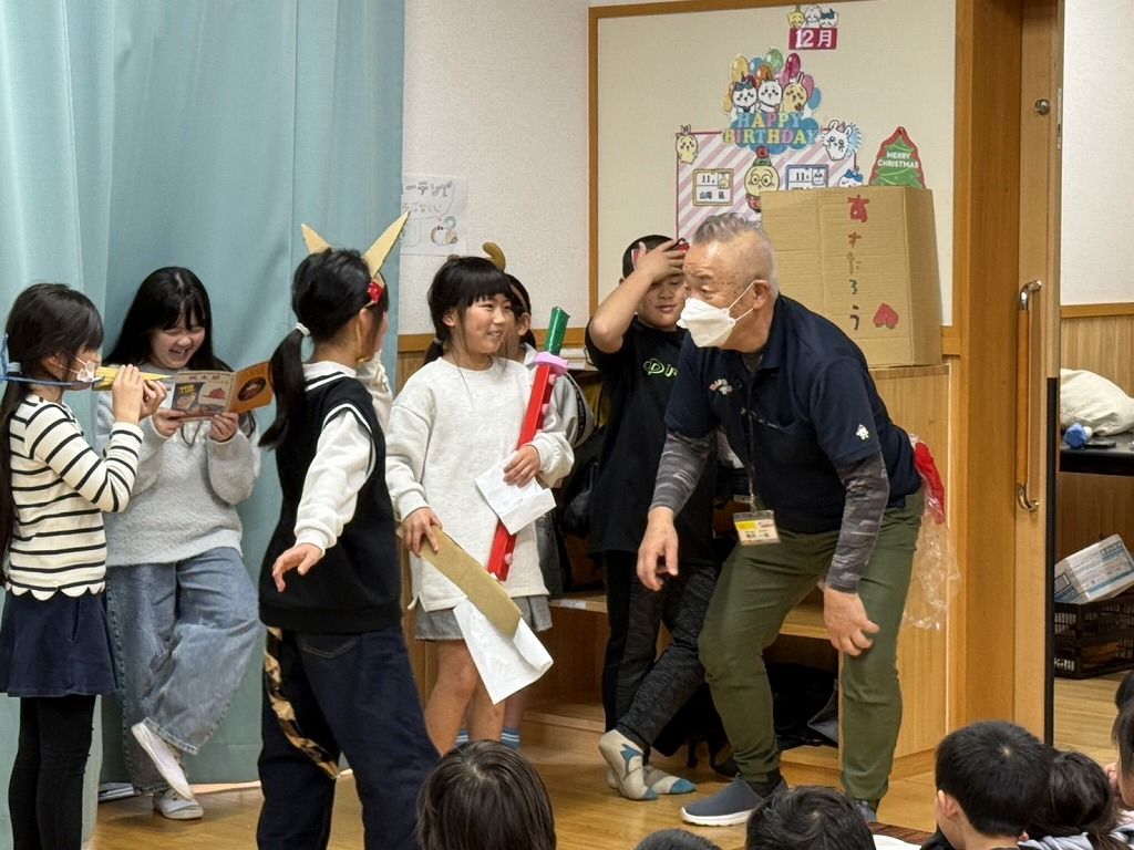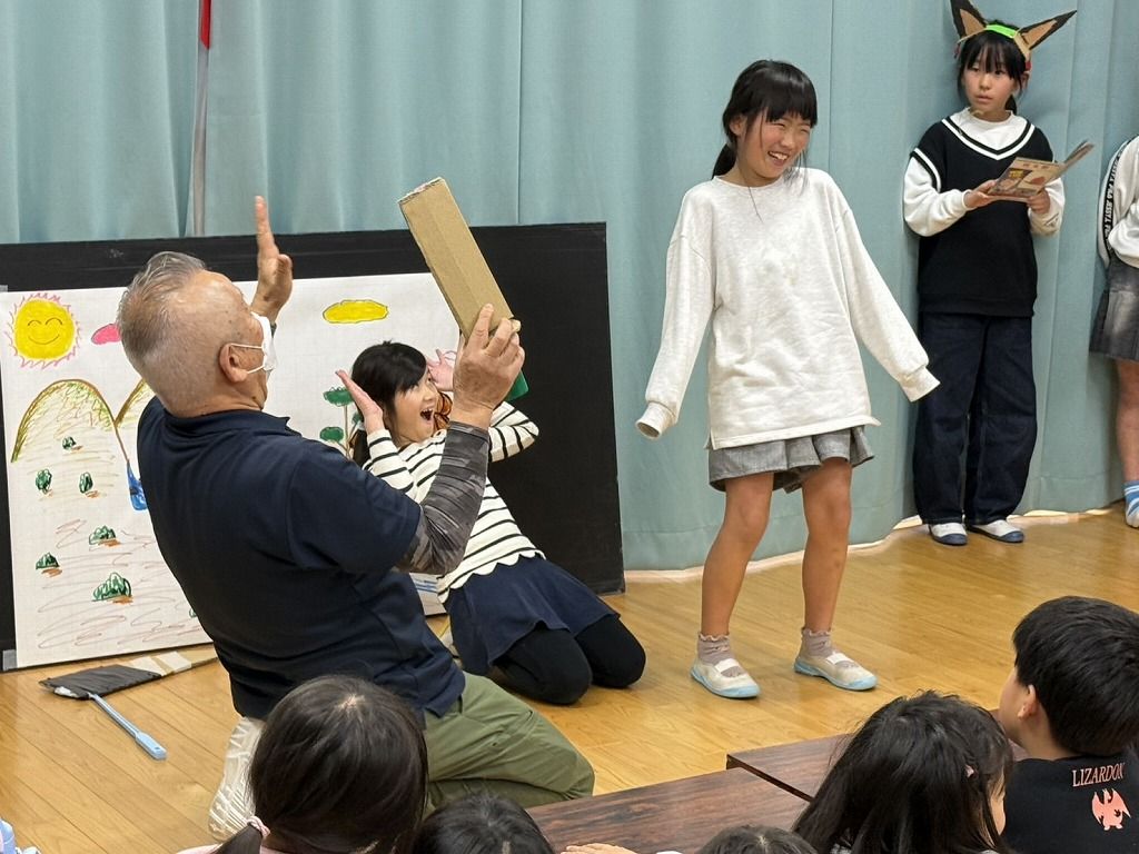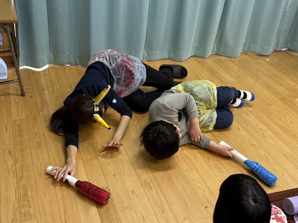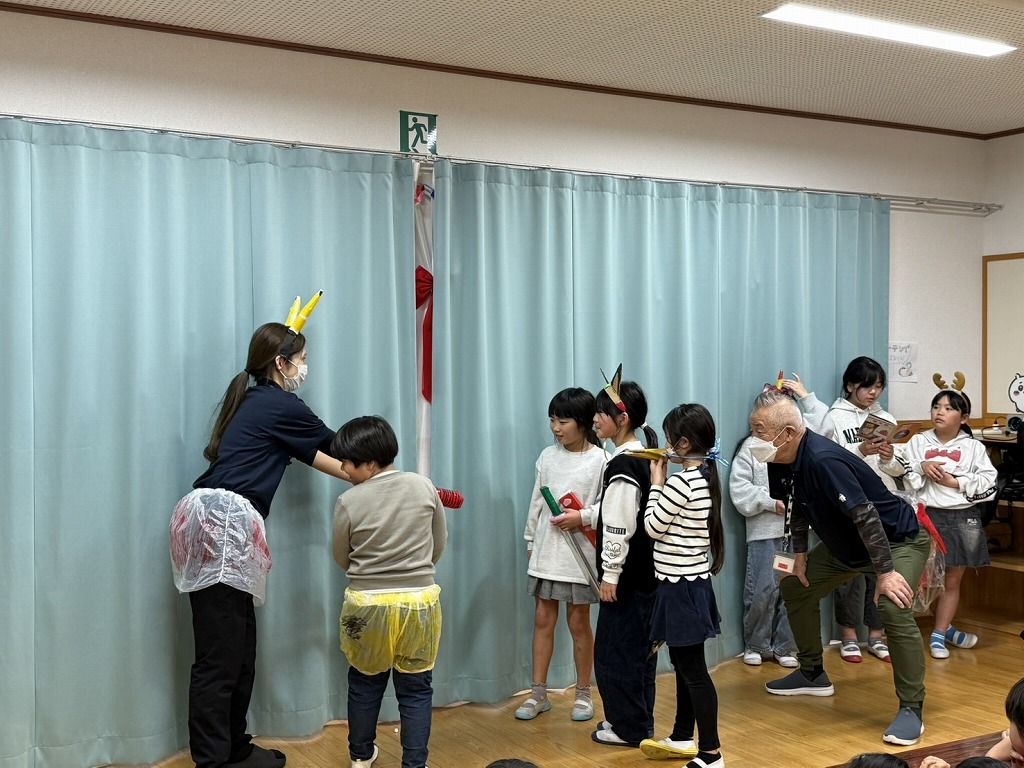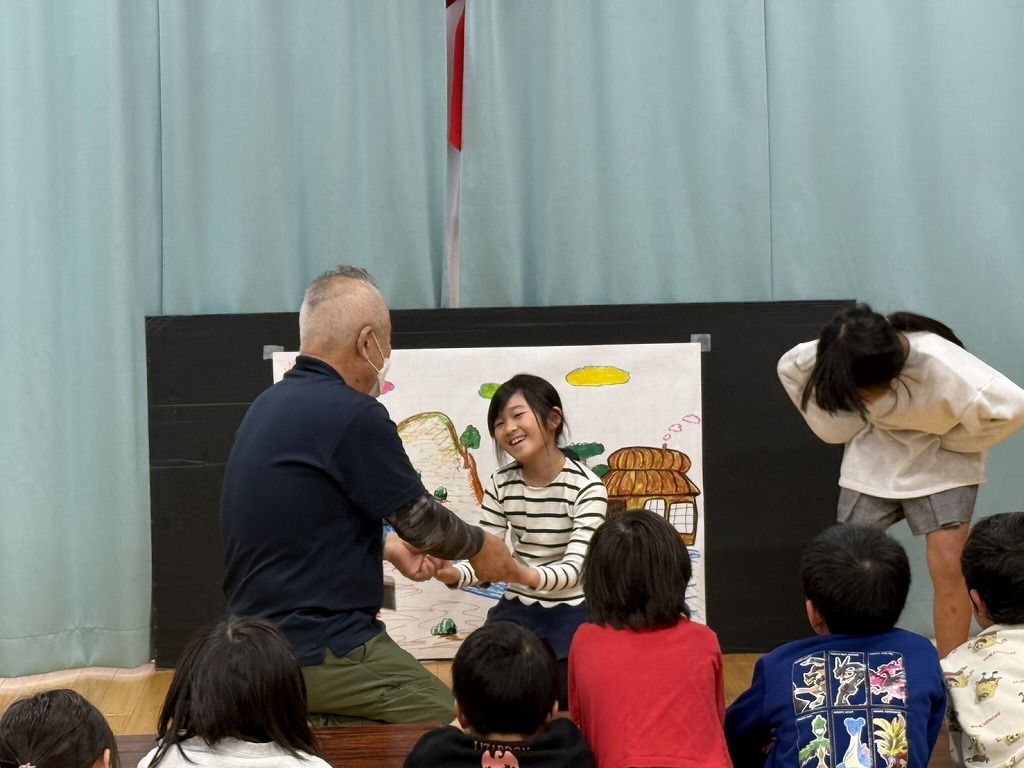次は2組による、「桃太郎」ならぬ「あすたろう」の劇です。 子どもたちと相談して、桃や剣などの小道具、衣装も一緒に制作しました。 当日、主役が休みとなり、急遽代役をつとめたお友達もいましたが、 みんなで協力して一生懸命がんばりました。