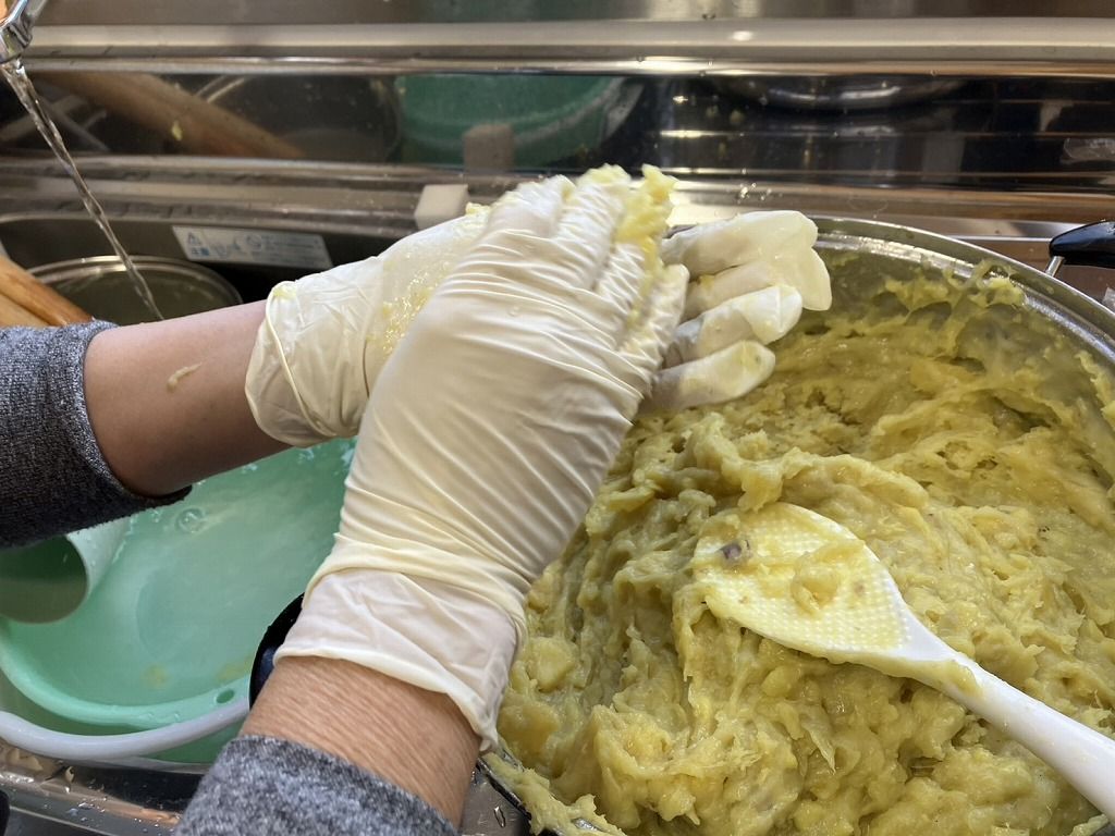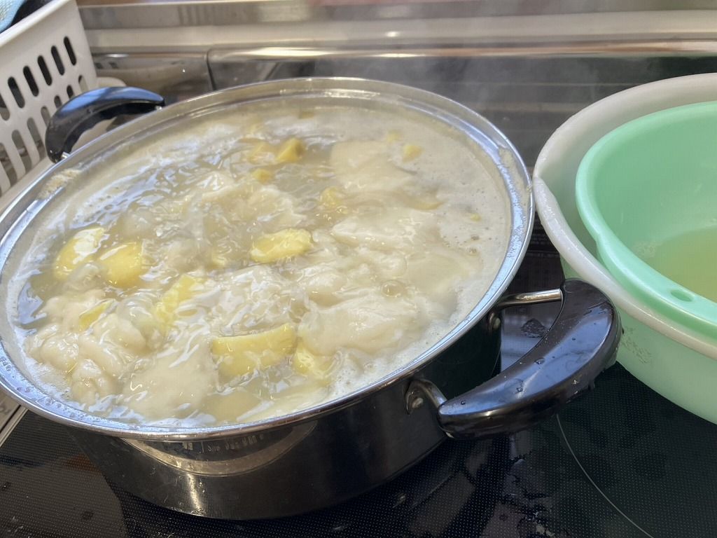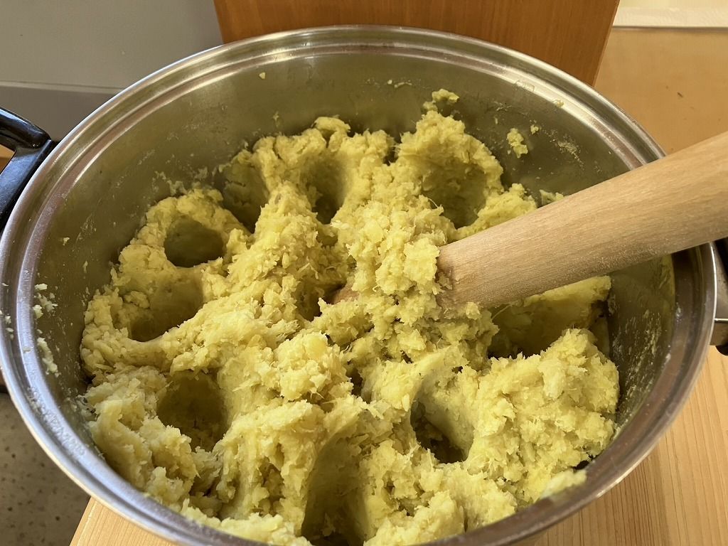 1.さつまいもと餅をゆでて、つぶします。