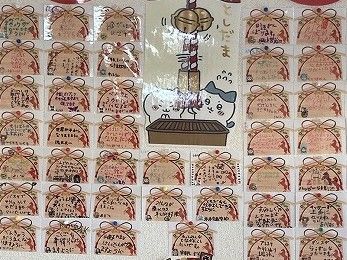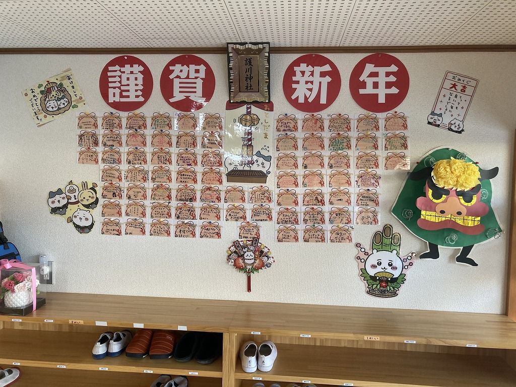 今年の願い事書いた絵馬が全員そろいました。 「家族みんなが健康でいられますように~」 「世界平和」 「幸せな一年になりますように」