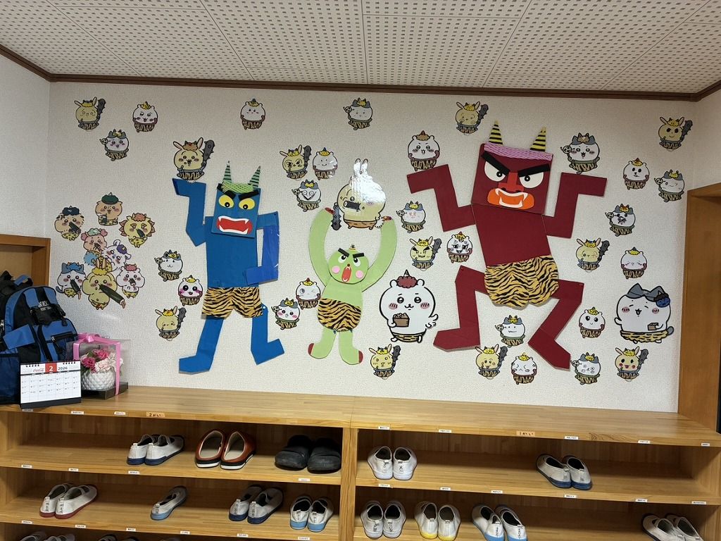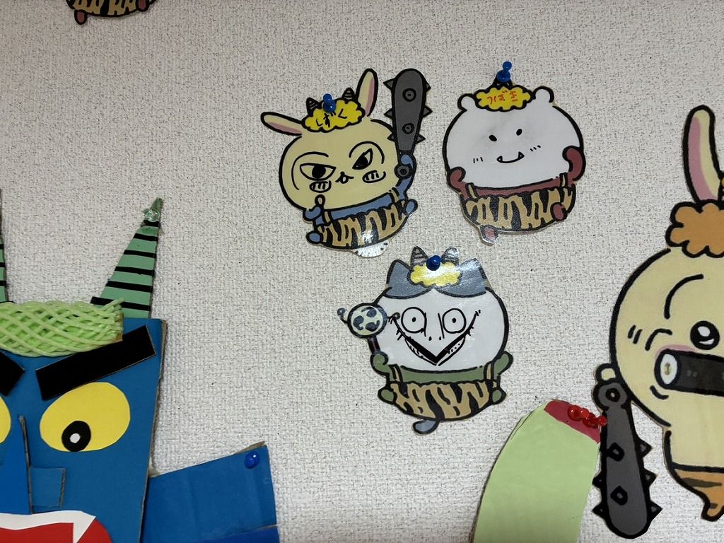 2月に入り玄関の壁面も変わりました。 子どもたちに、節分の鬼の顔を描いてもらったら、とって「かわいい鬼」になってしまいました。