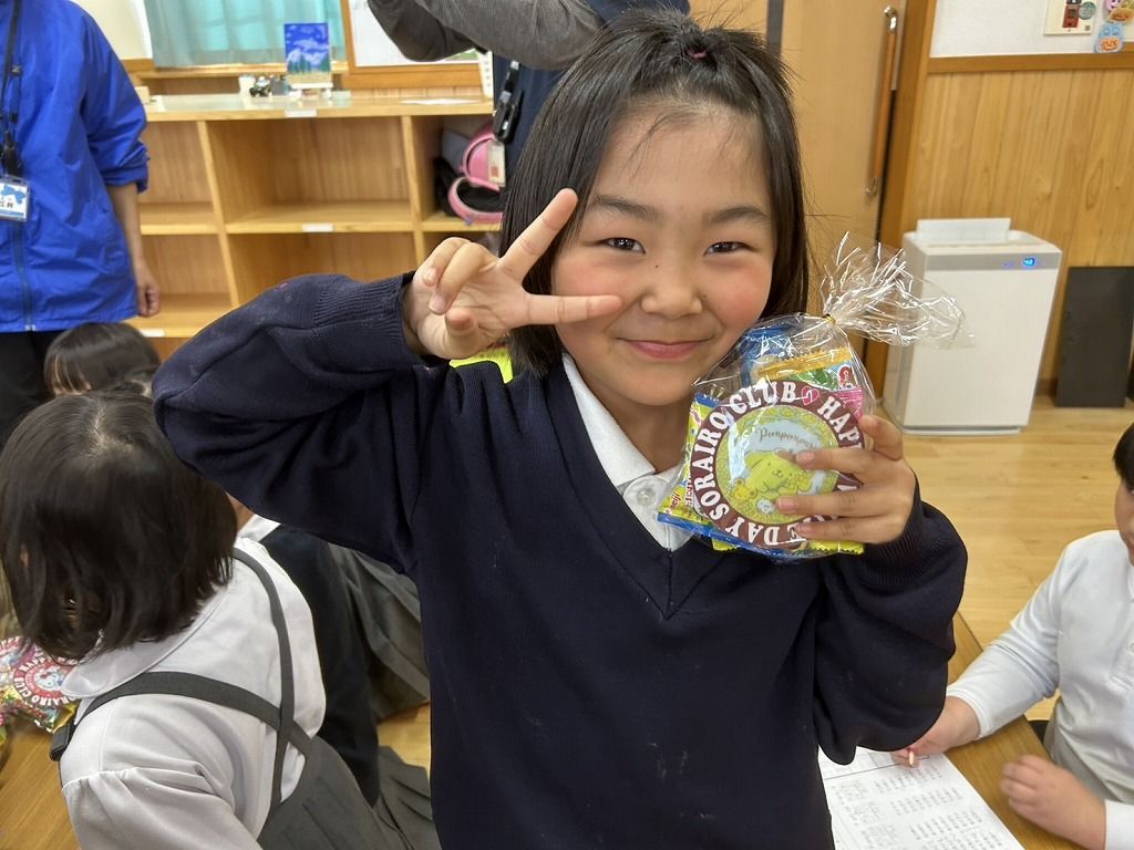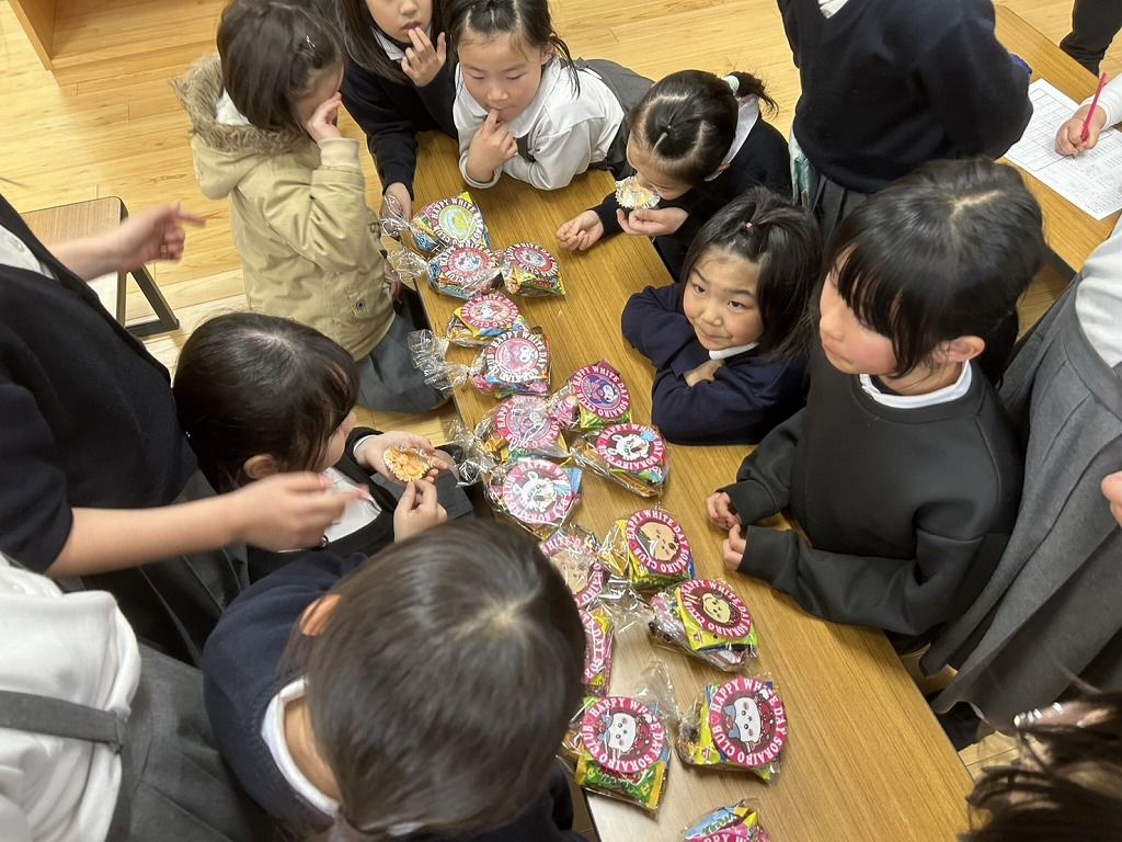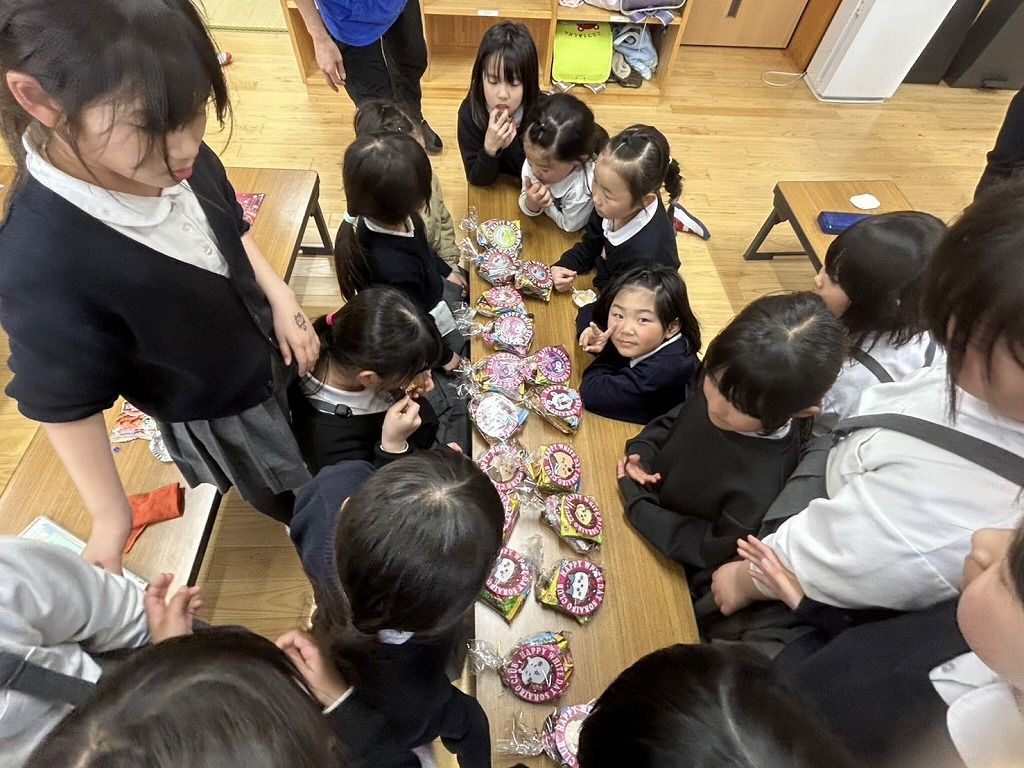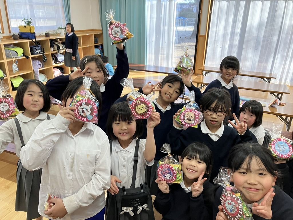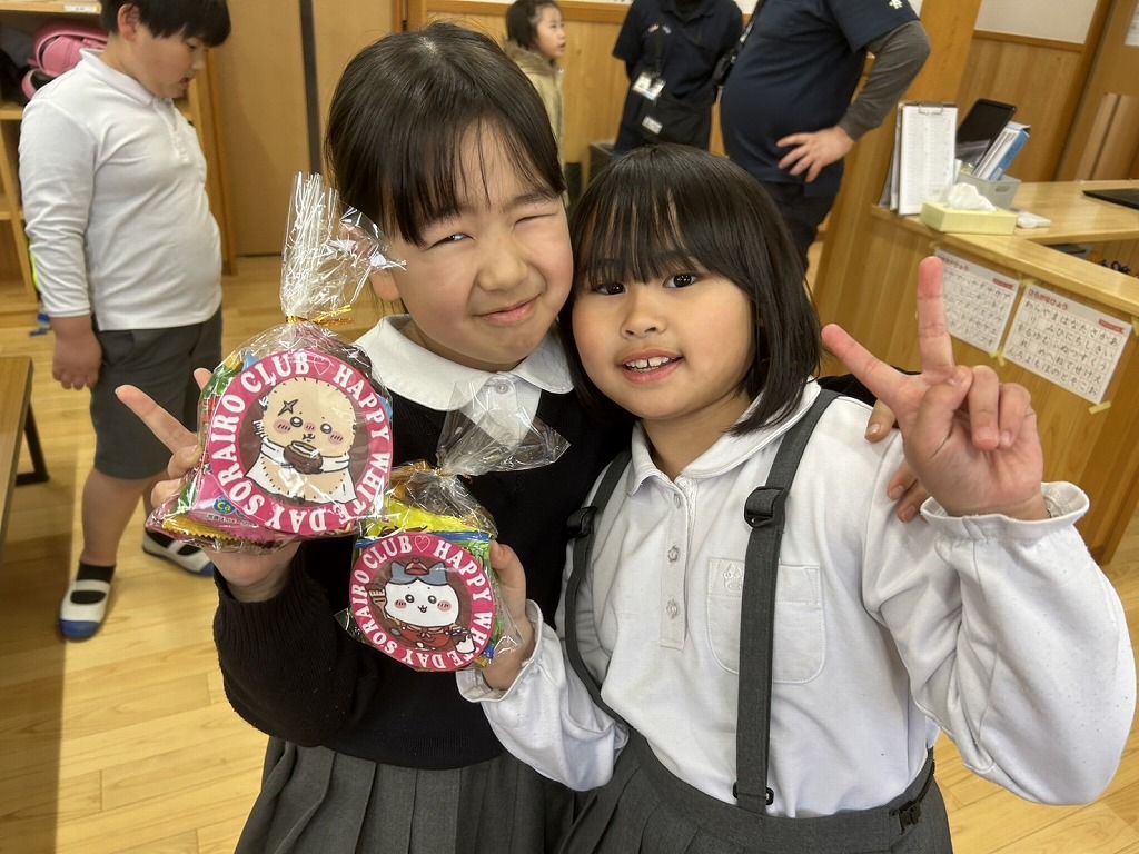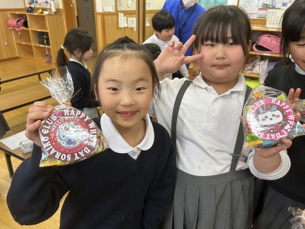 ホワイトデーにも子どもたちが大好きなキャラクターでラッピングしたお菓子を配りました。