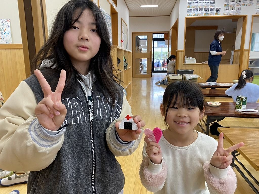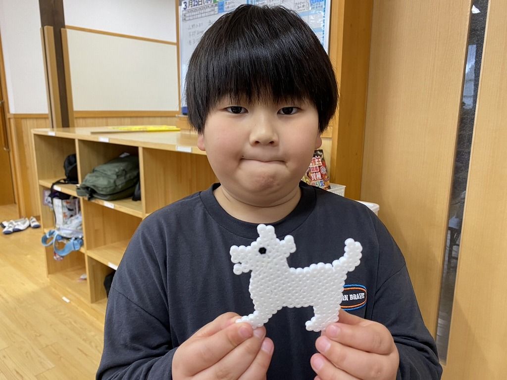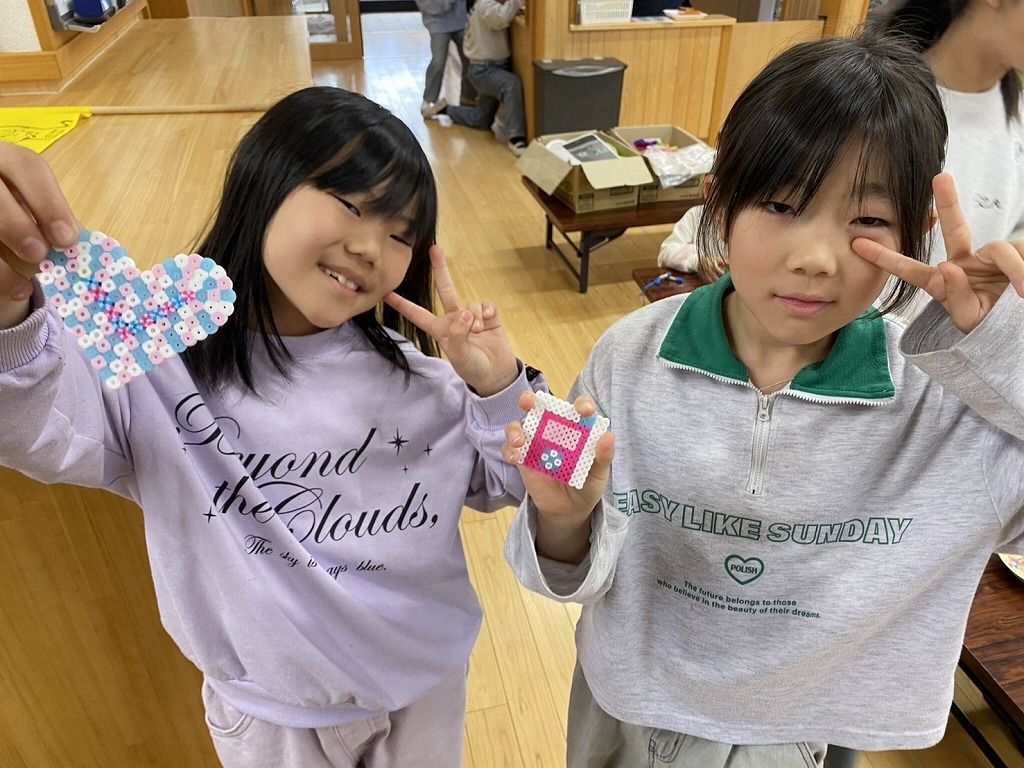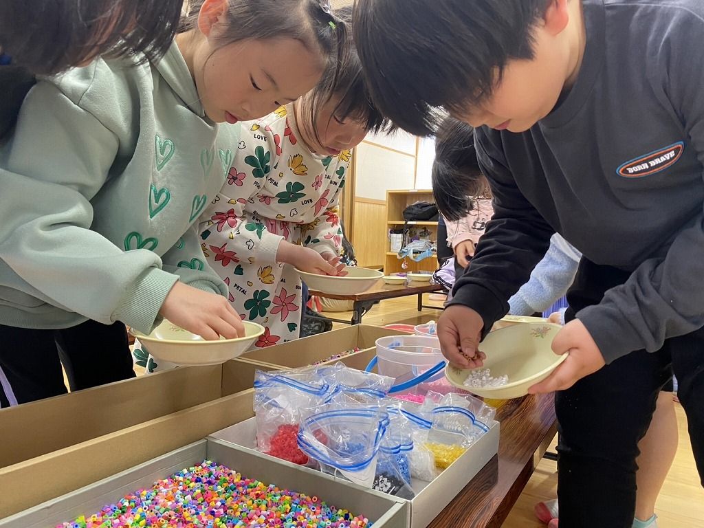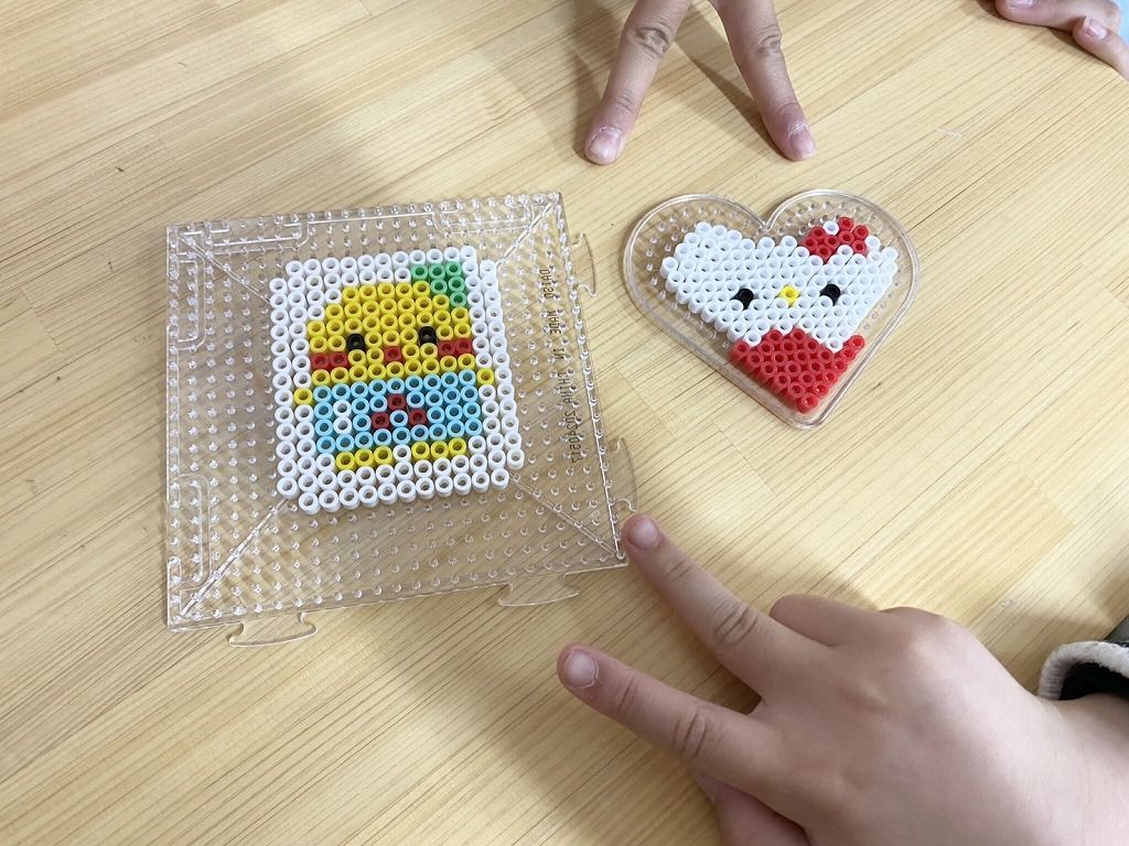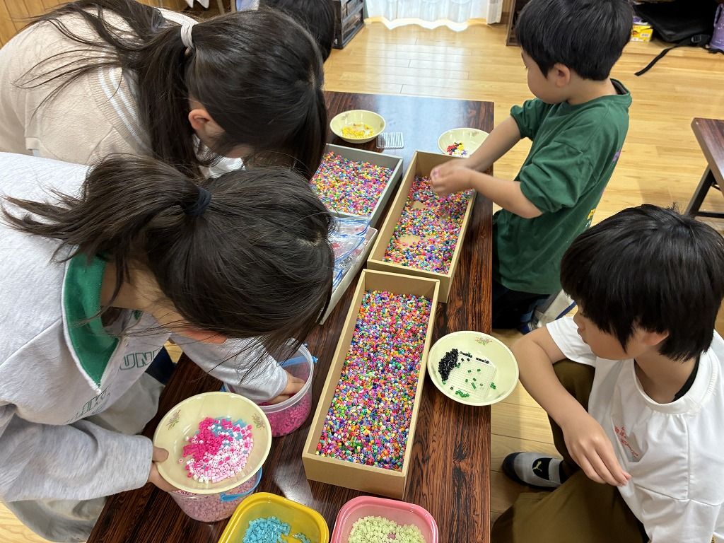 今日はあいにくの雨で「すもう大会」が中止になりました。 みんな、とっても楽しみにしていたのに残念でした。 そこで今日は、久しぶりに「アイロンビーズ」を作りました。