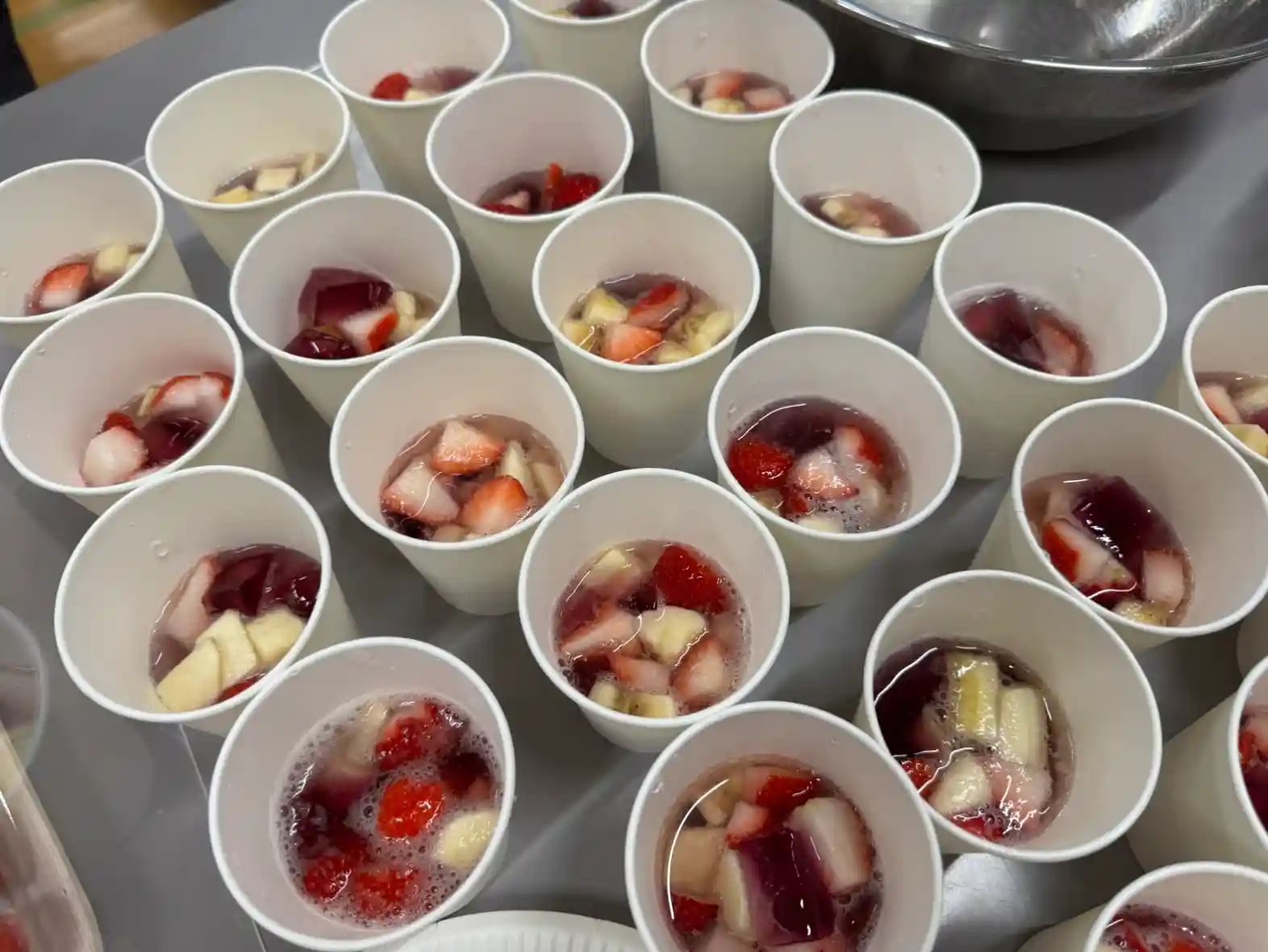 フルーツポンチは果物とゼリーにサイダーを注いで