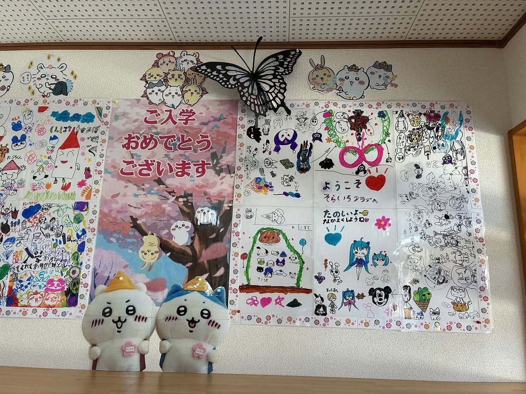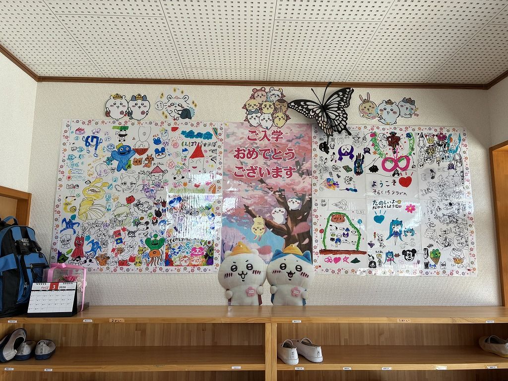 新1年生の歓迎ボードが出来上がり、玄関の壁面に飾りました。 みんな、たくさんの絵を描いてくれました。