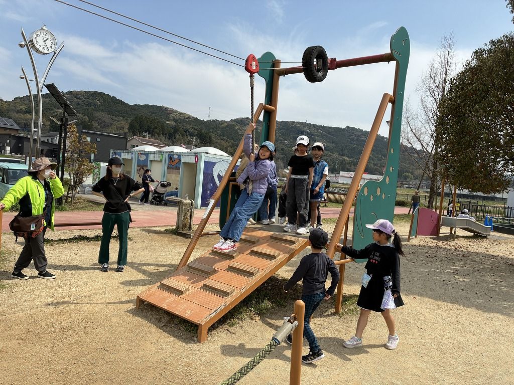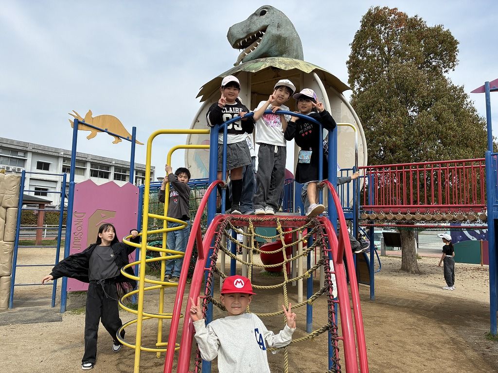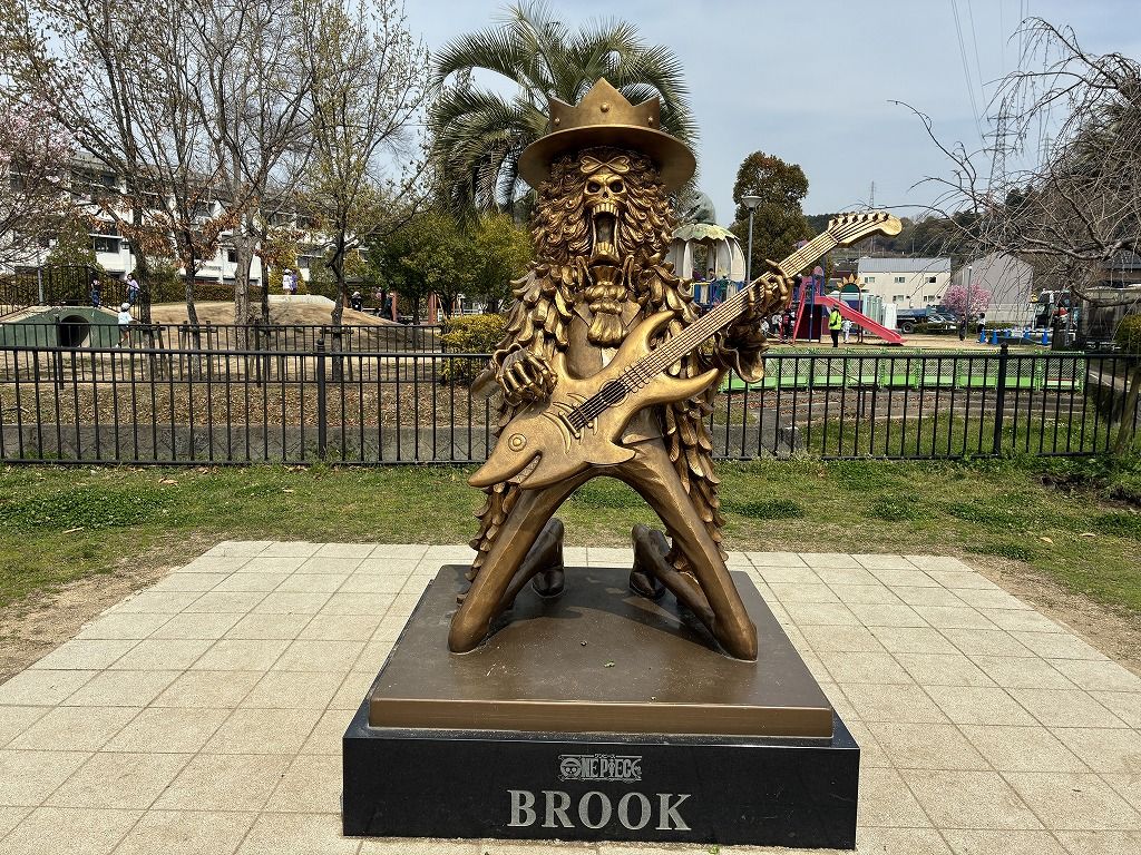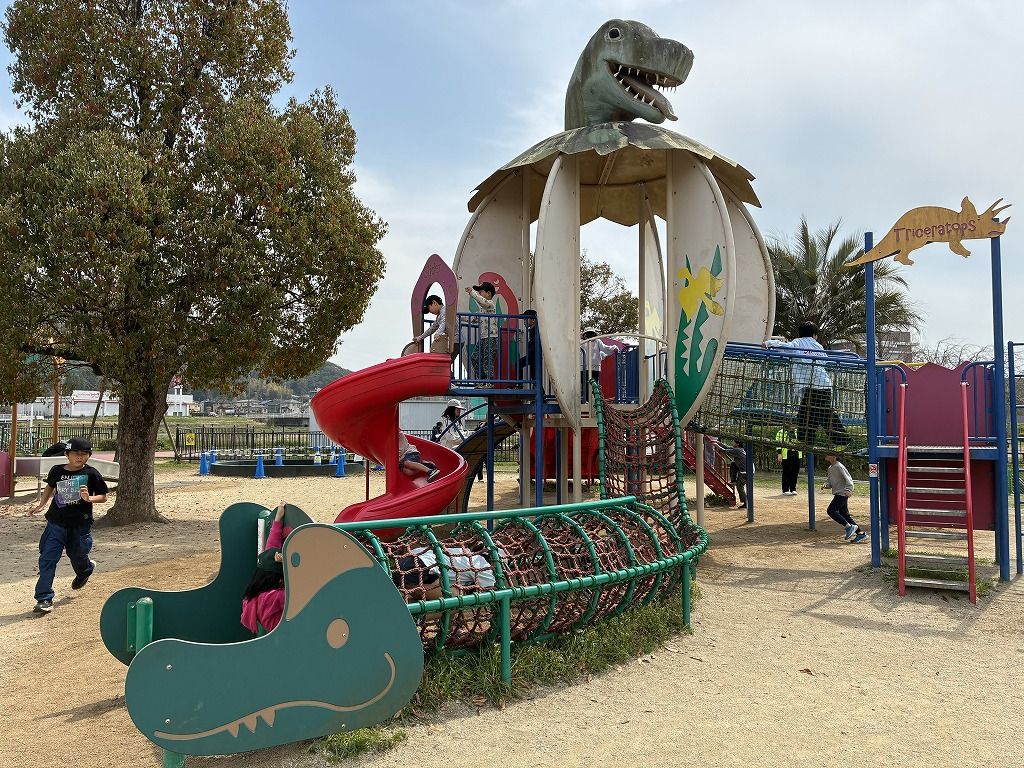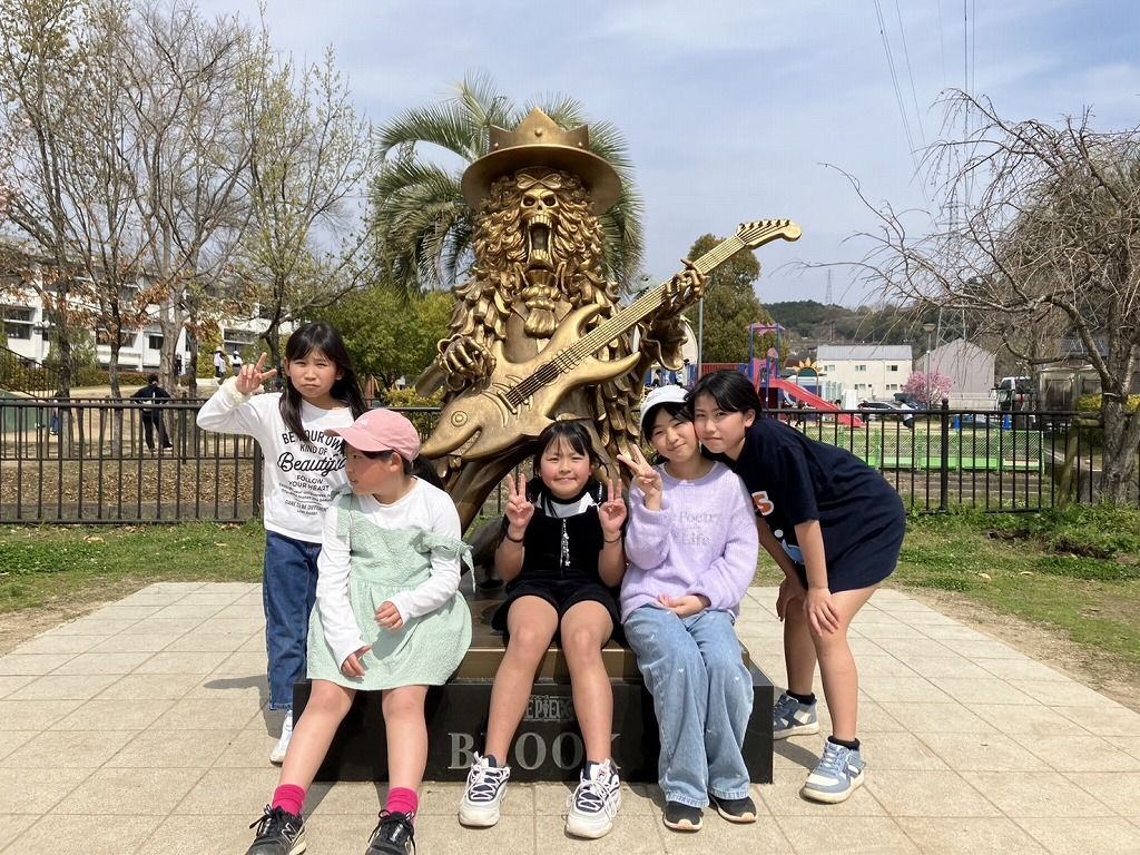 昼食は、御船町のふれあい広場(恐竜公園)で食べました。 公園には、ワンピースのブルック像があります。 たくさんの恐竜の形をした遊具や、すべり台、ジャングルジム、ターザンロープなどもあり、元気いっぱい遊びまわっていました。