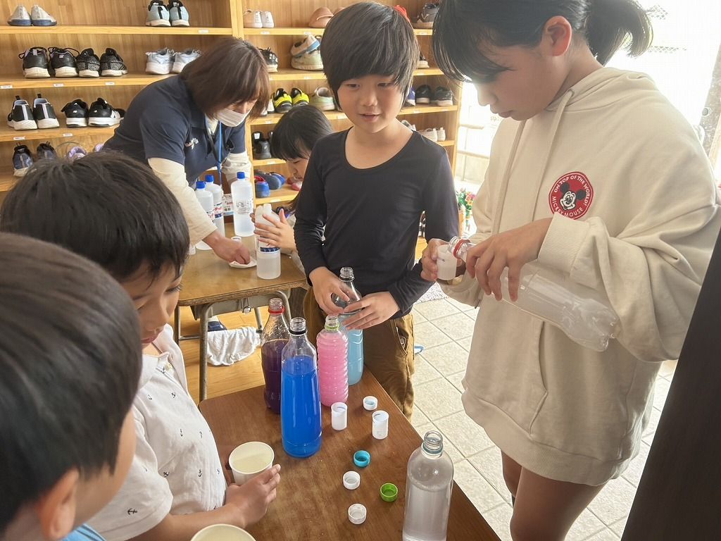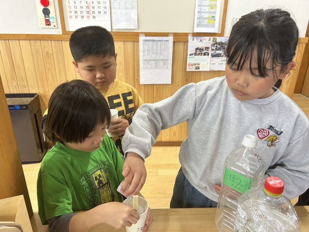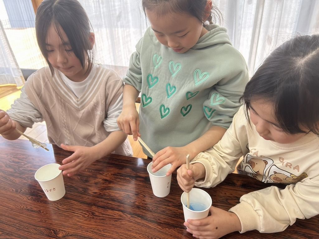 色水を作ったり、洗濯のり、魔法の水を計って入れてくれました。 紙コップに入れた3種の液体をまぜまぜ~!!