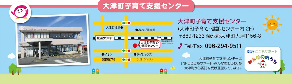 NPOこどもサポート・みんなのおうちは、大津町子育て・健診センター内2階の「大津町子育て支援センター」にて、4つの事業を行っています。